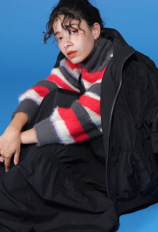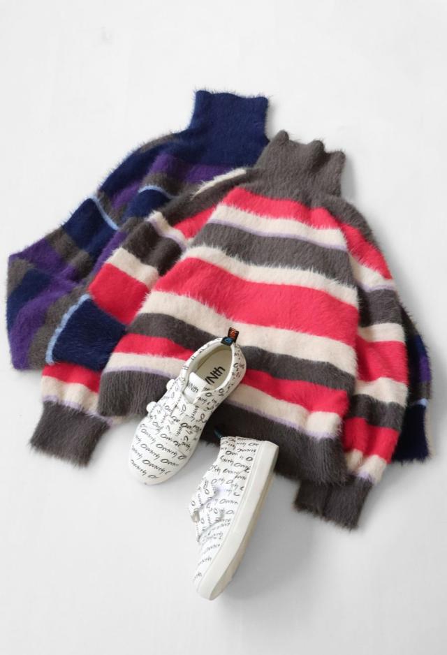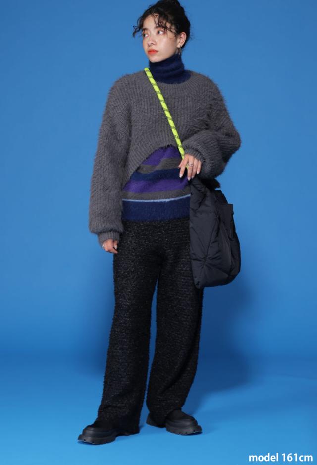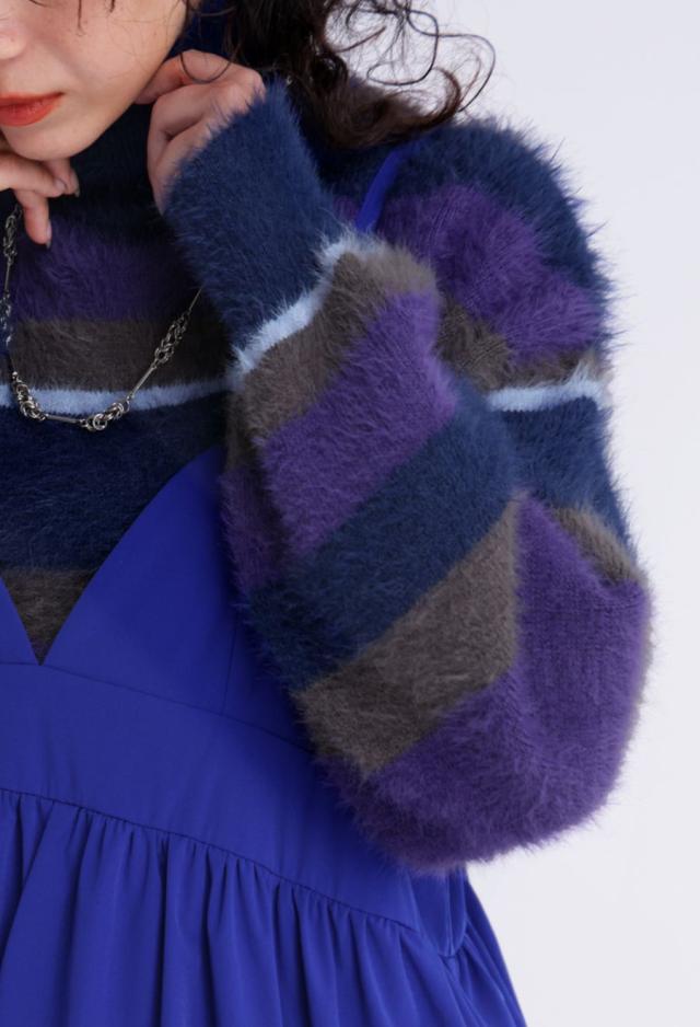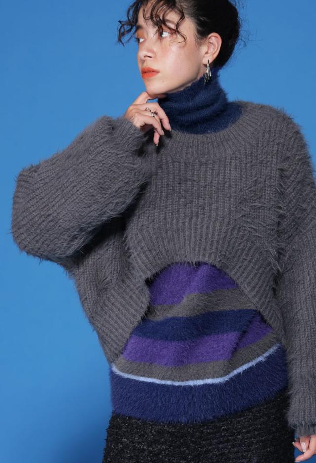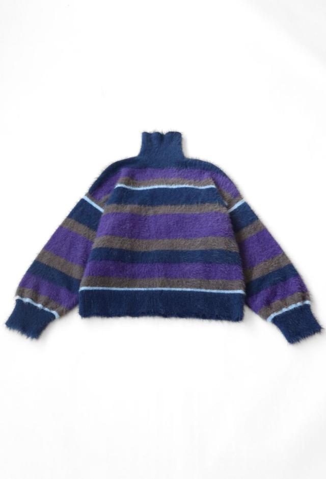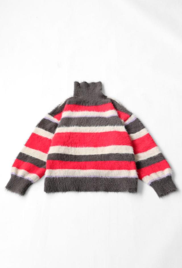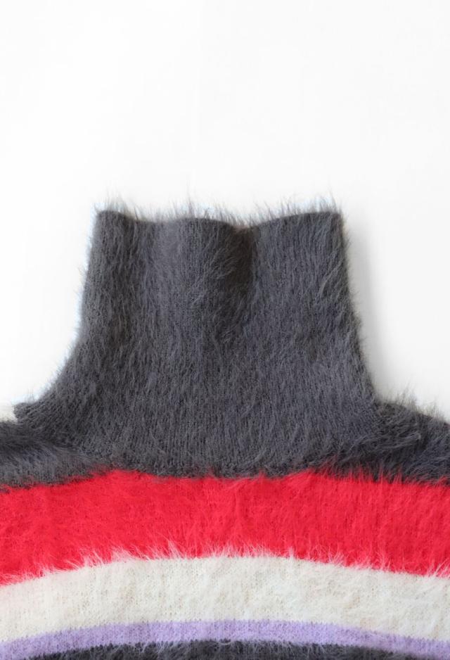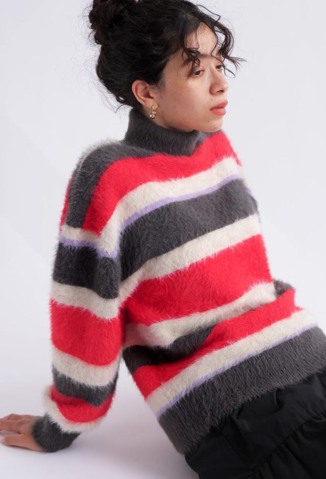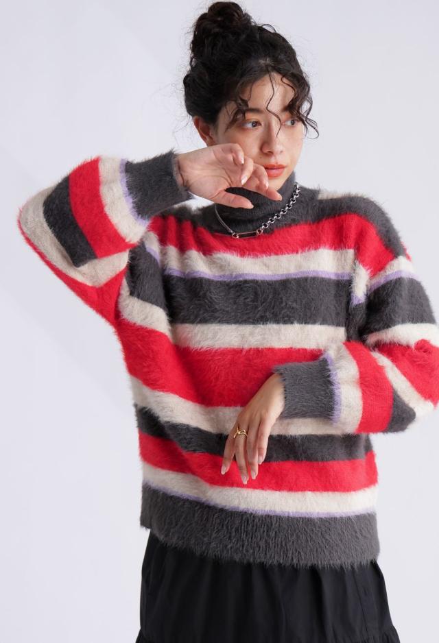 毛足のある表情豊かなシャギーニットで仕立てた、遊び心溢れるボーダータートルネックニットトップスです。