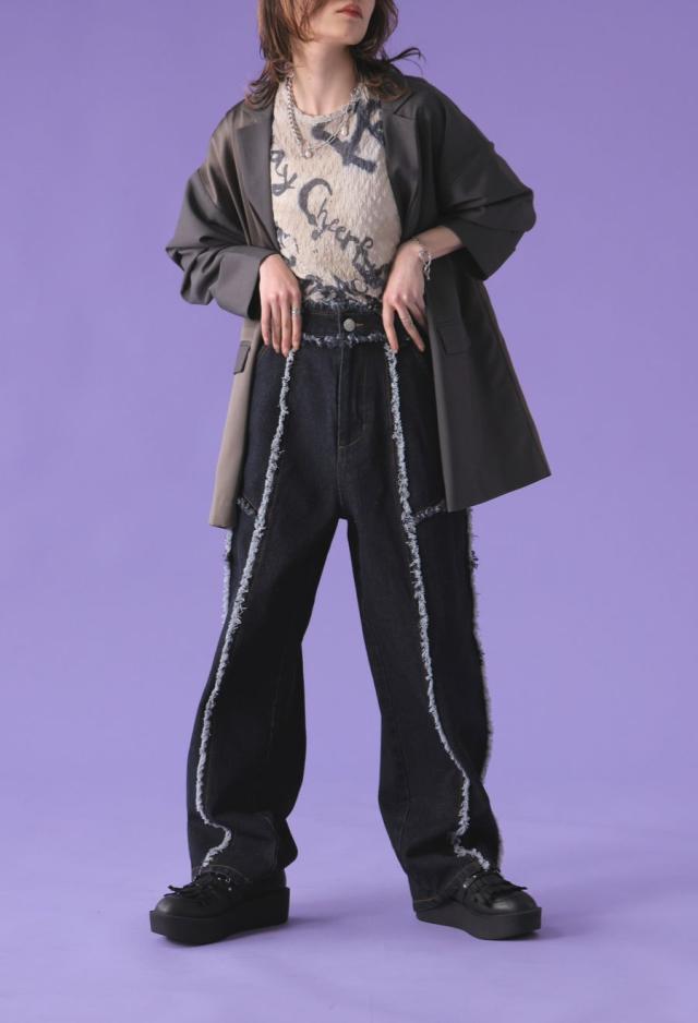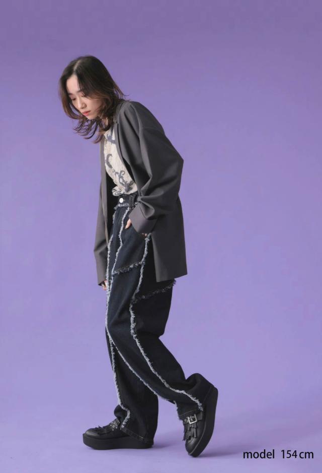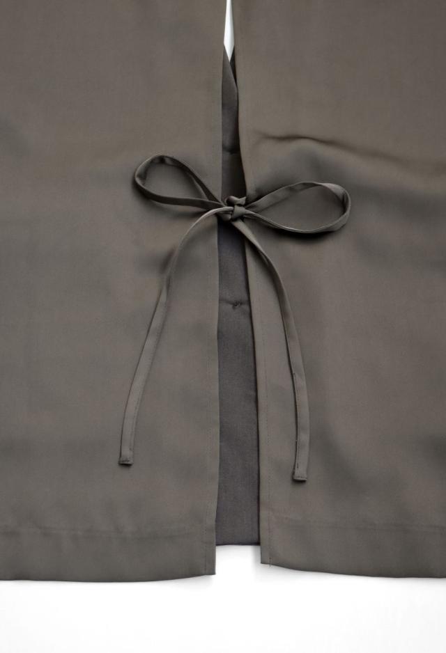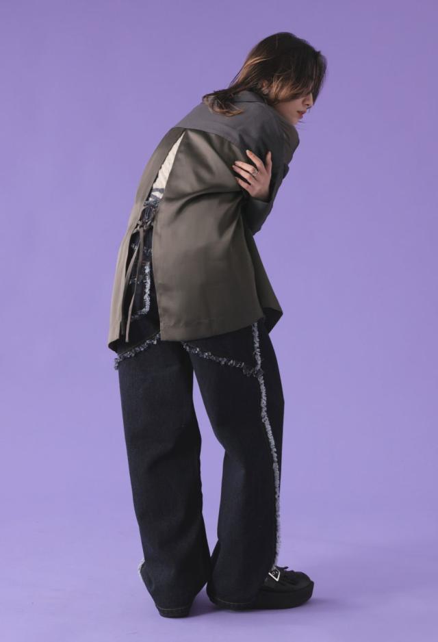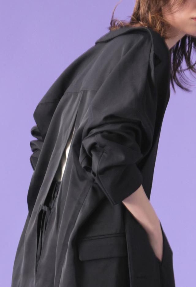 背面には深めのバックスリットを取り入れ、動くたびに揺れるシルエットが印象的。