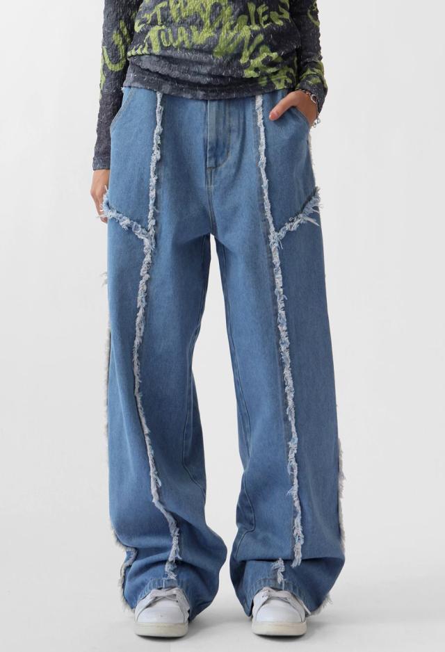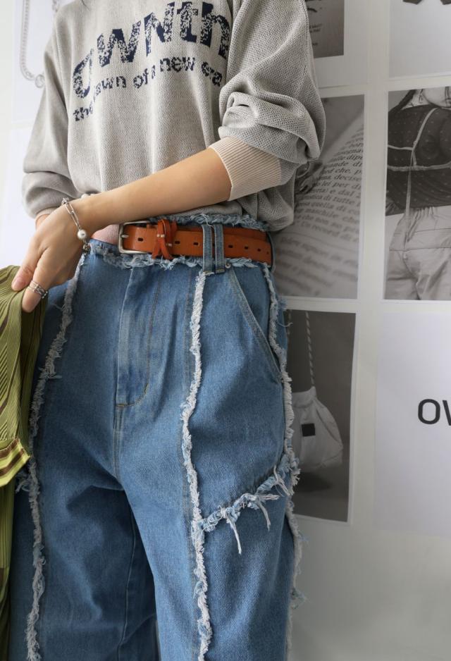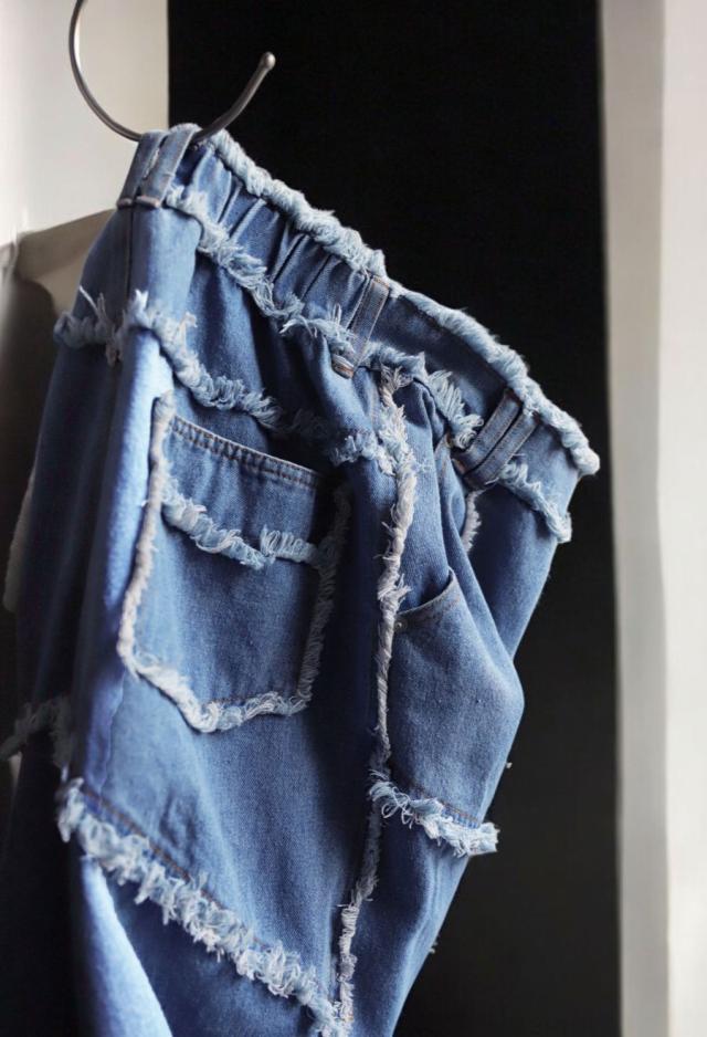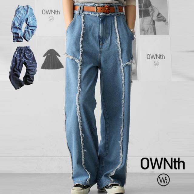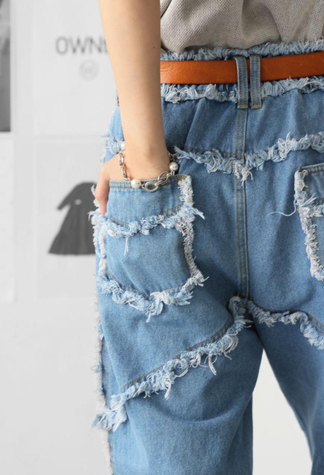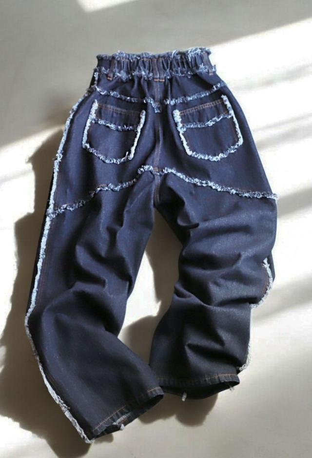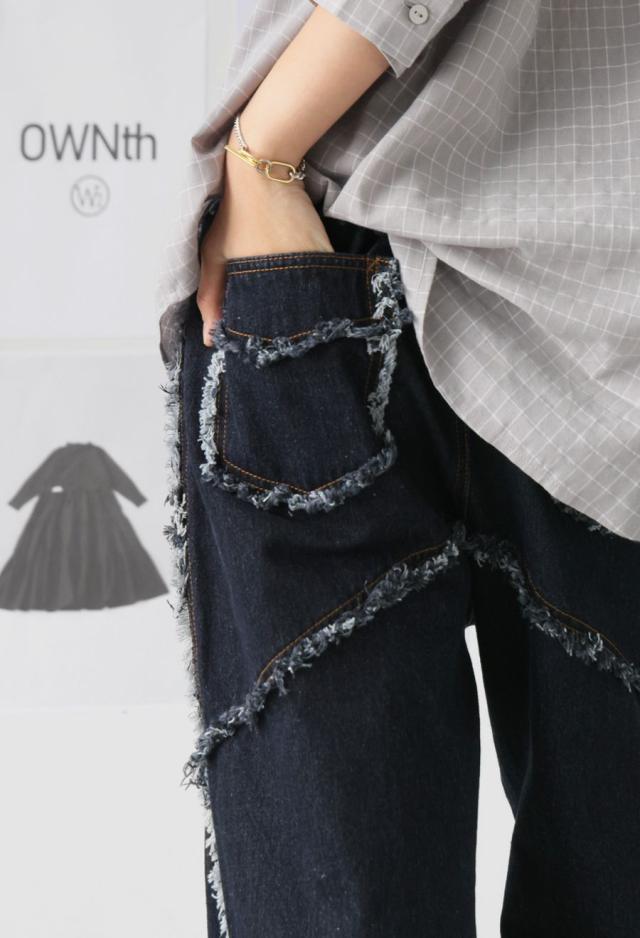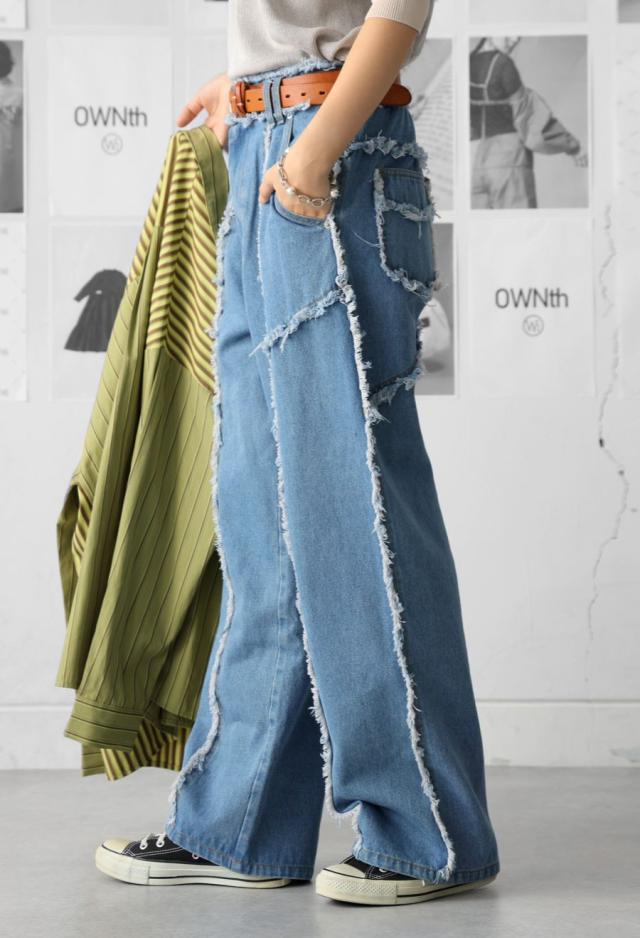 owt-0113 パンツ デニム Gパン フリンジ ワイドストレート ウエストゴム 快適 体型カバーポケット付き おしゃれ デイリー シンプル カジュアル ナチュラル ユニセックス
