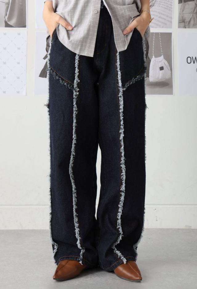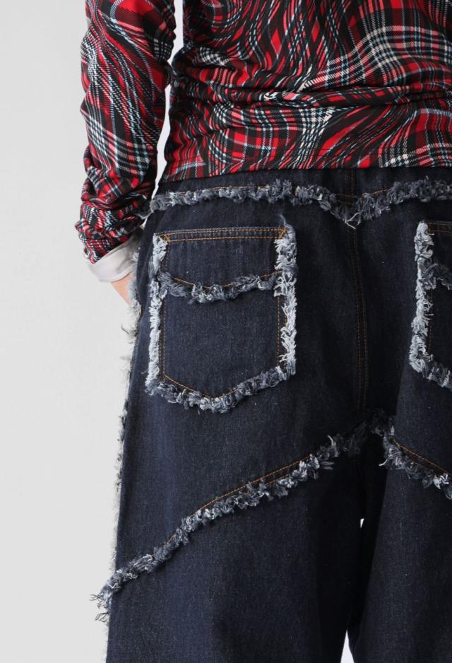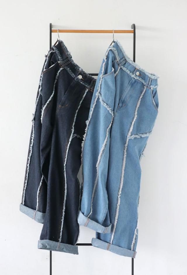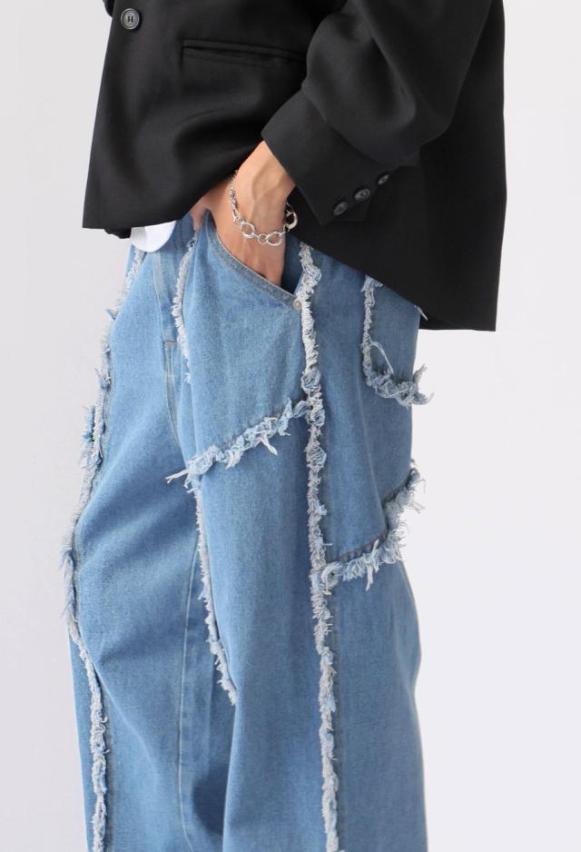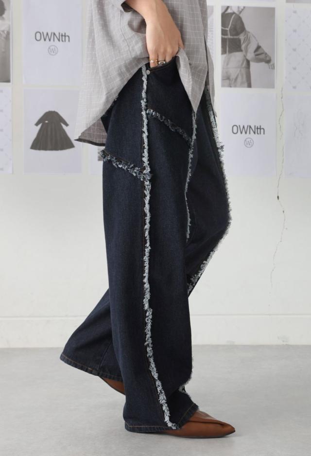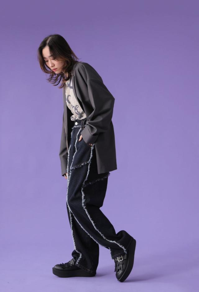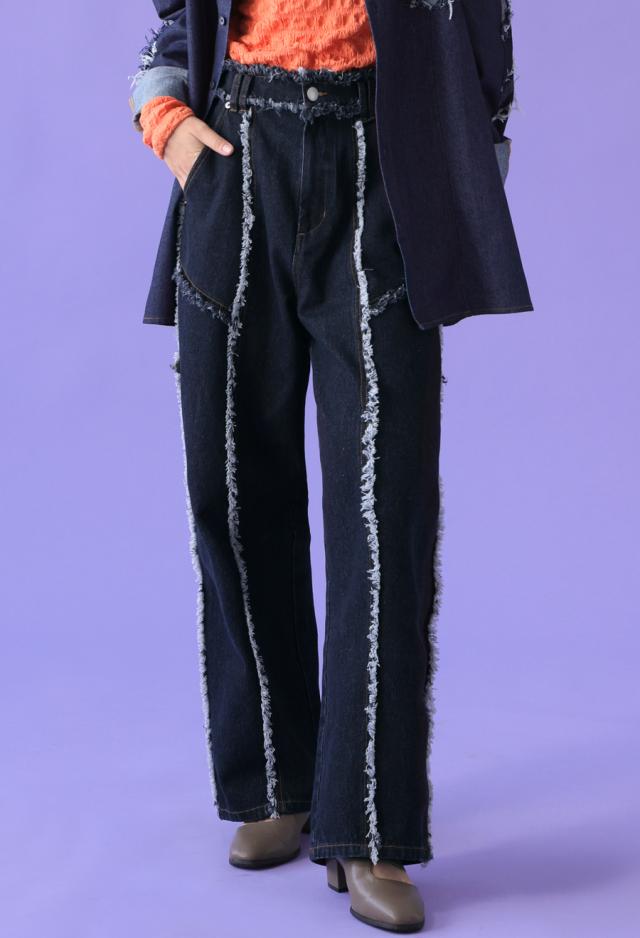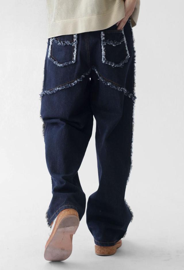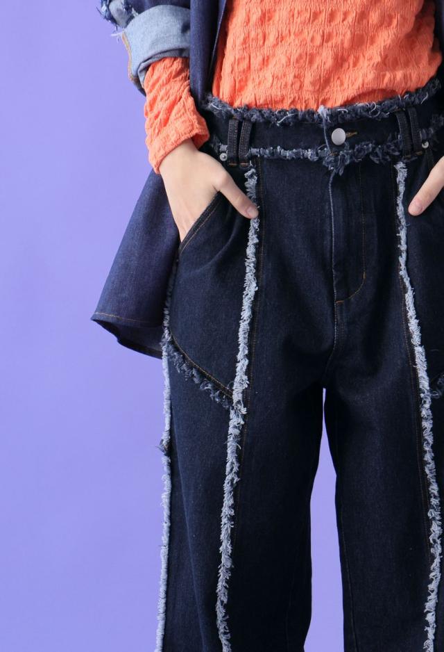 エッジの効いたフリンジラインが目を惹くデニムパンツです。