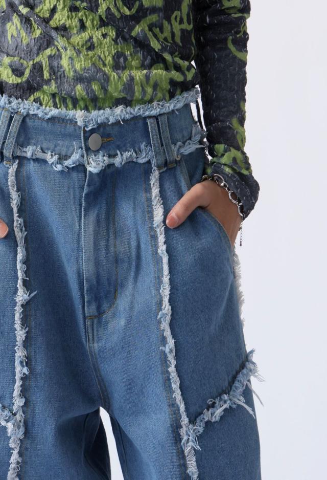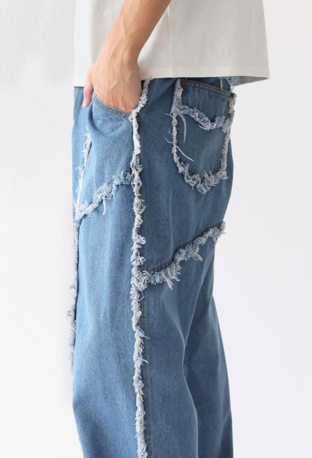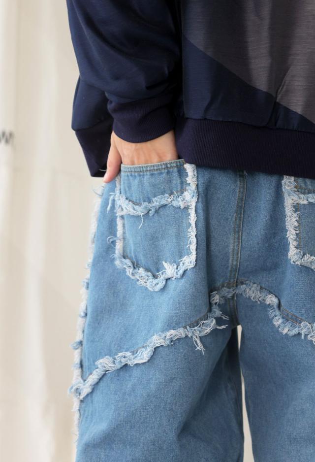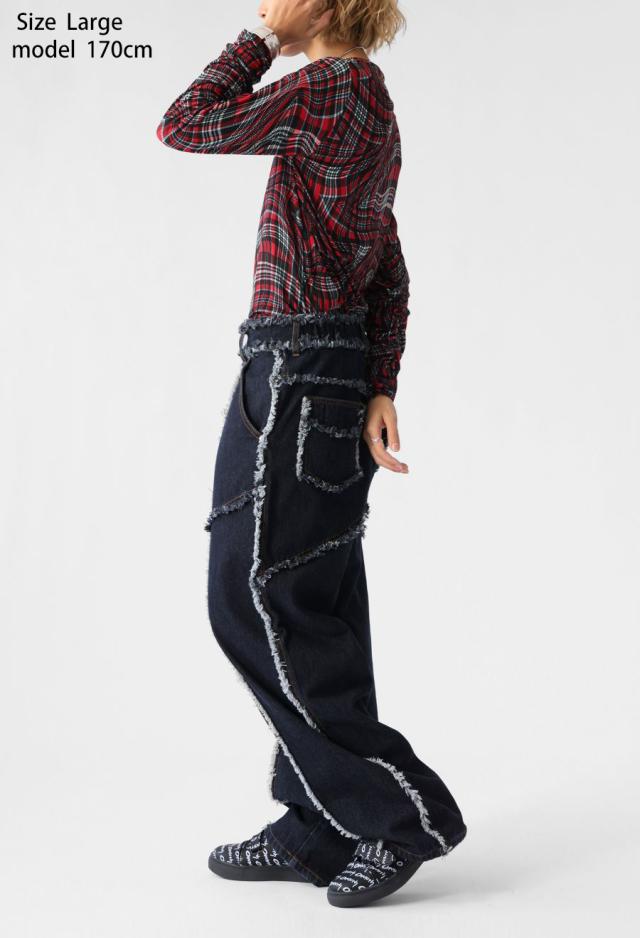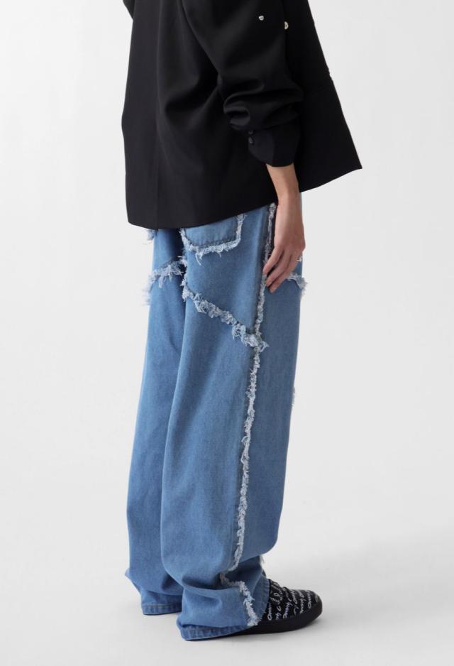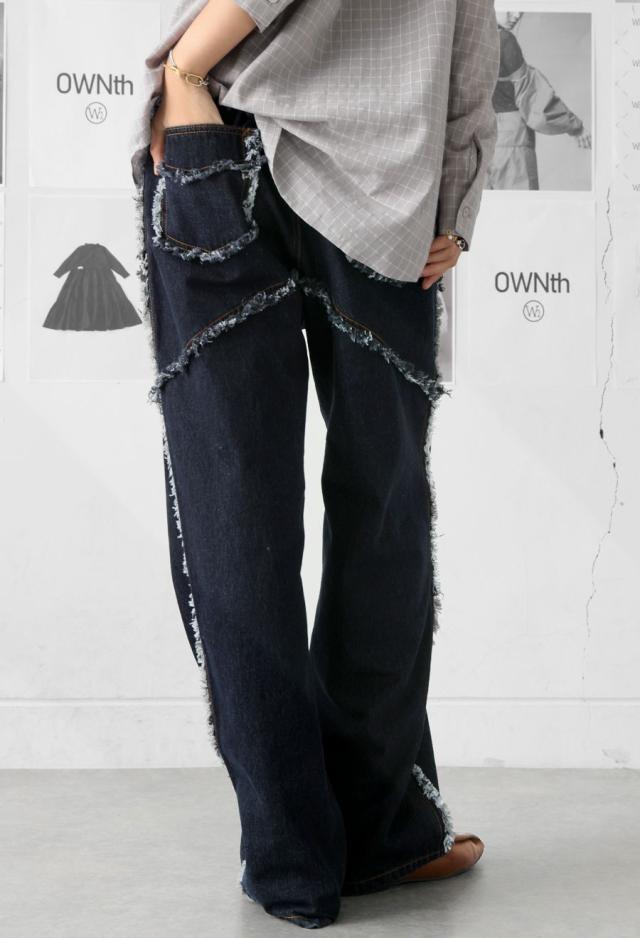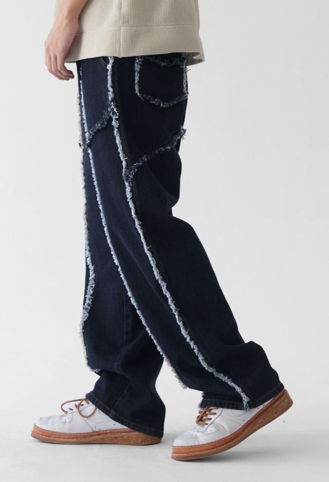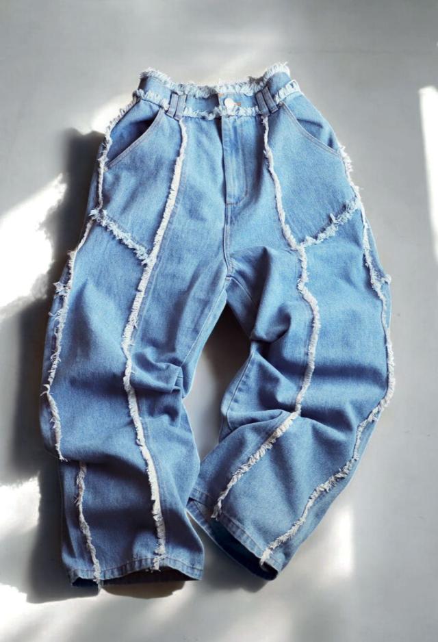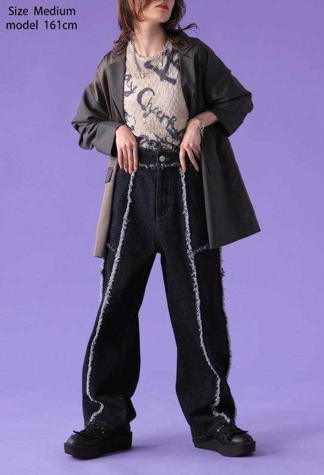 エッジの効いたフリンジラインが目を惹くデニムパンツです。
