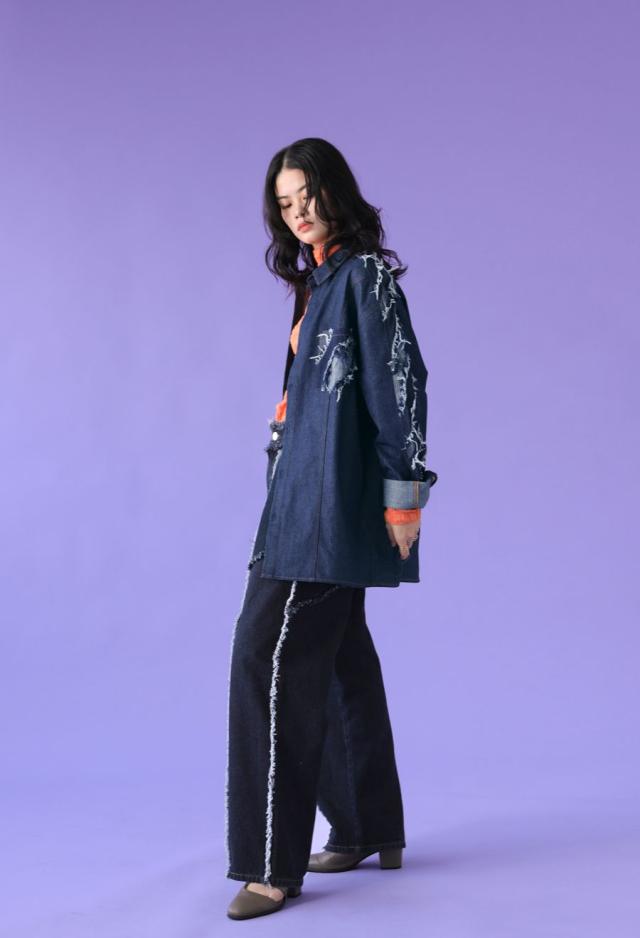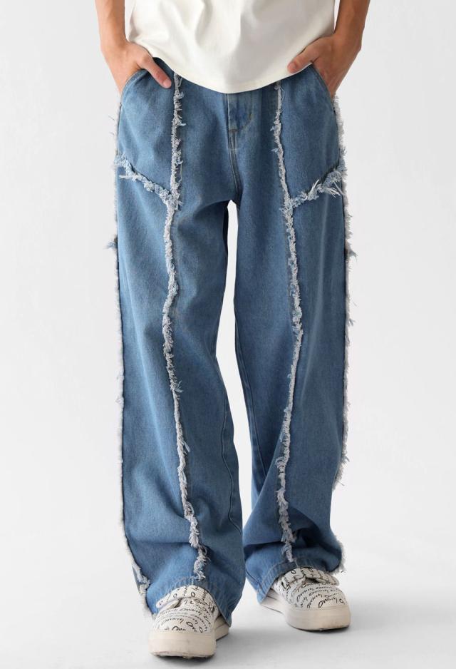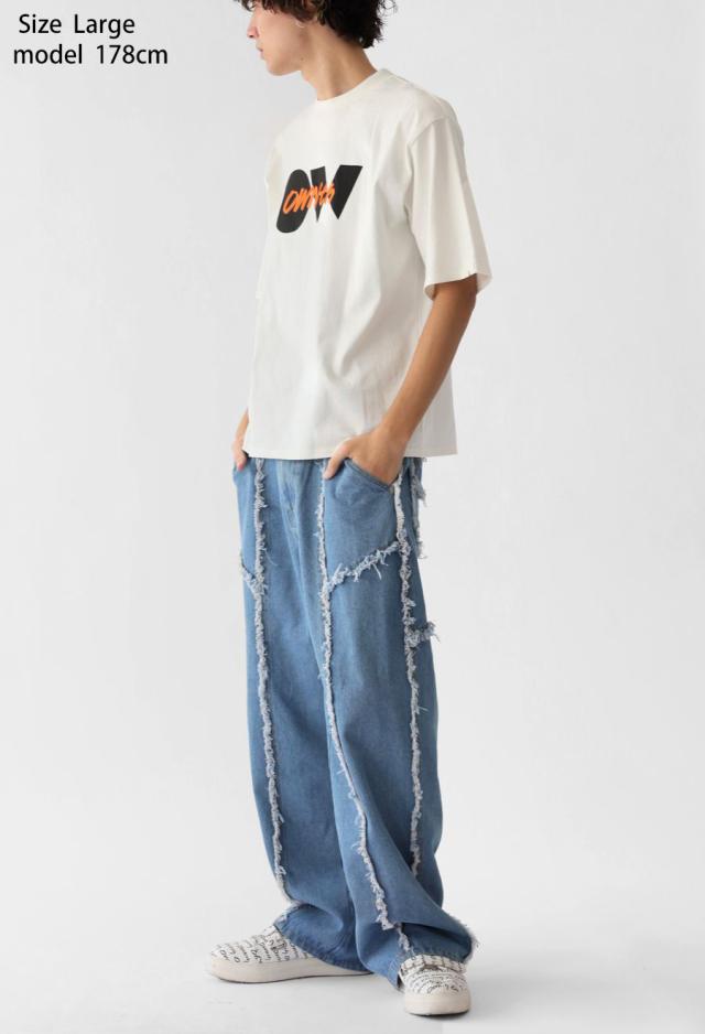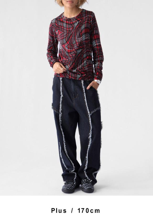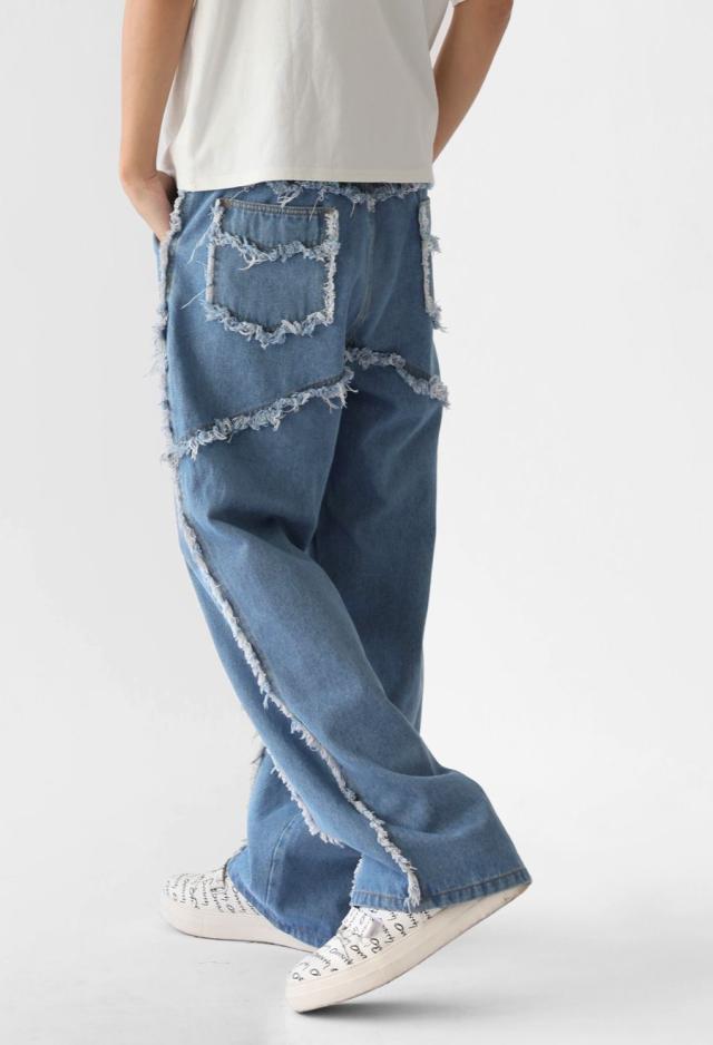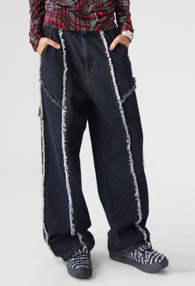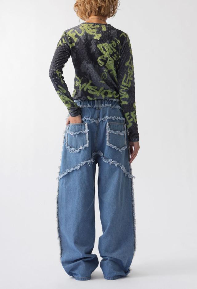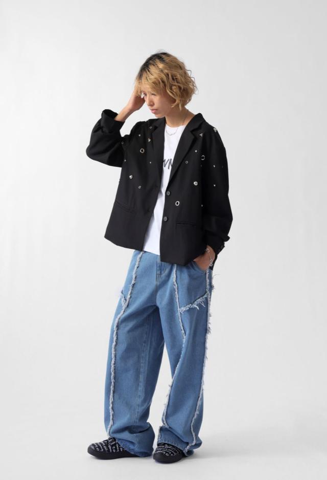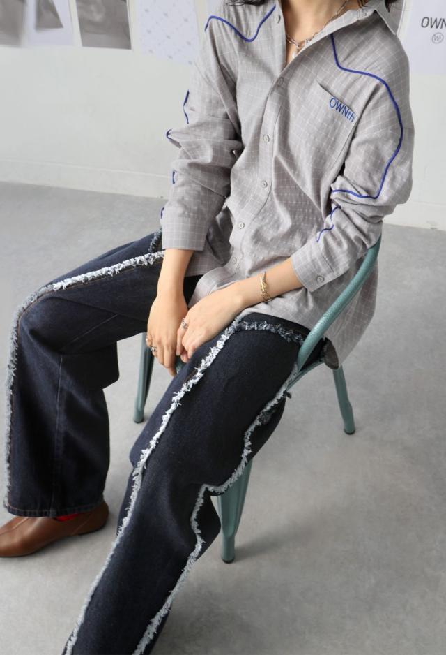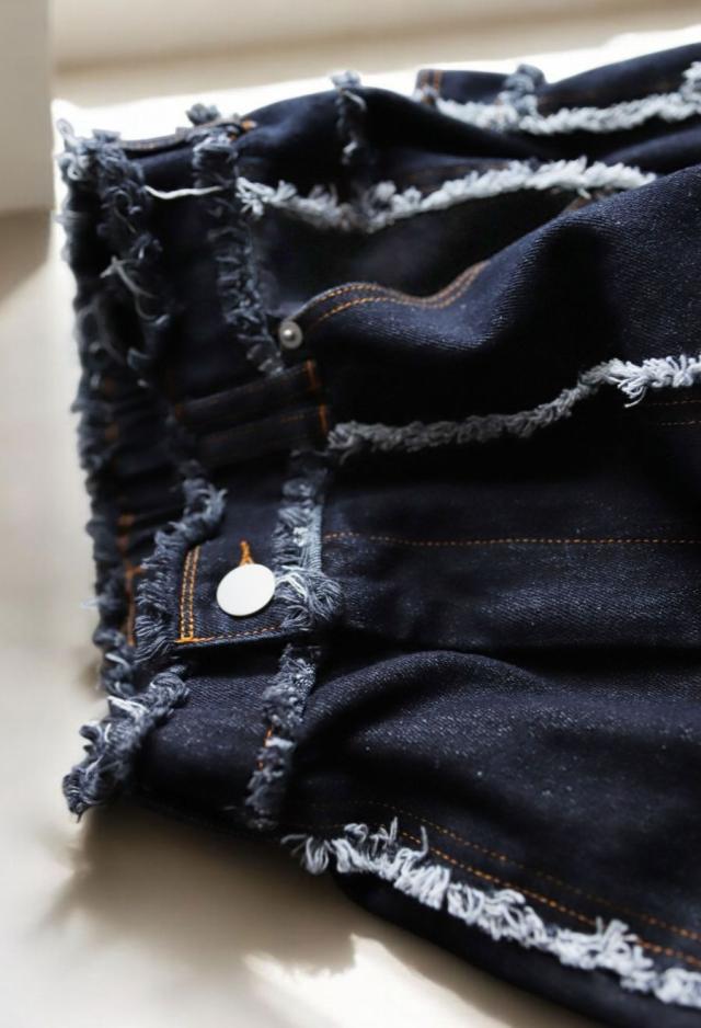 エッジの効いたフリンジラインが目を惹くデニムパンツです。
