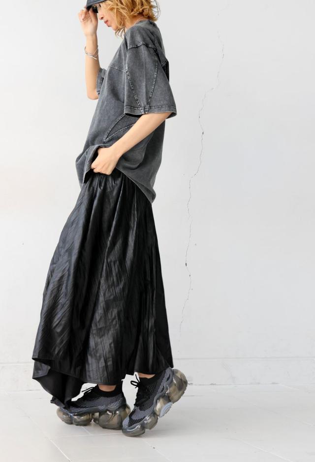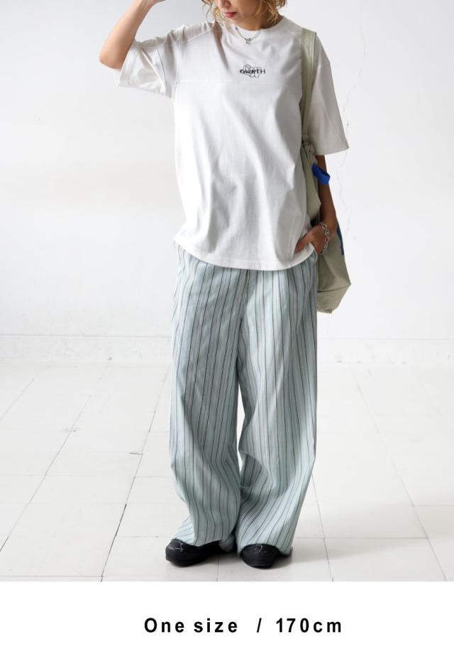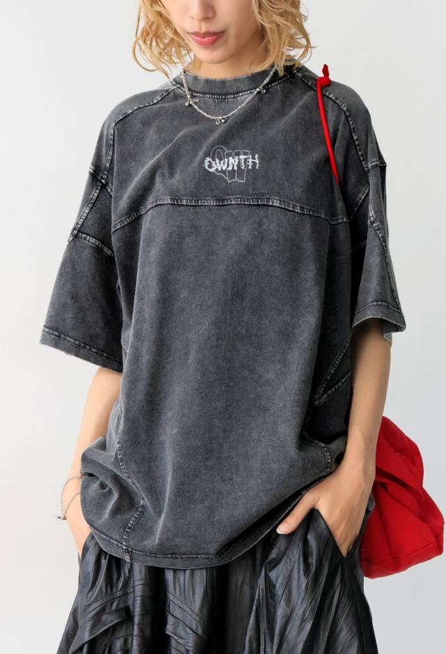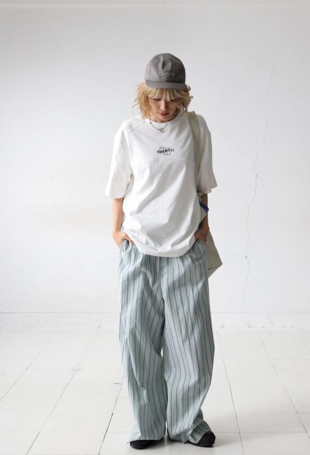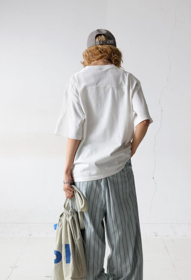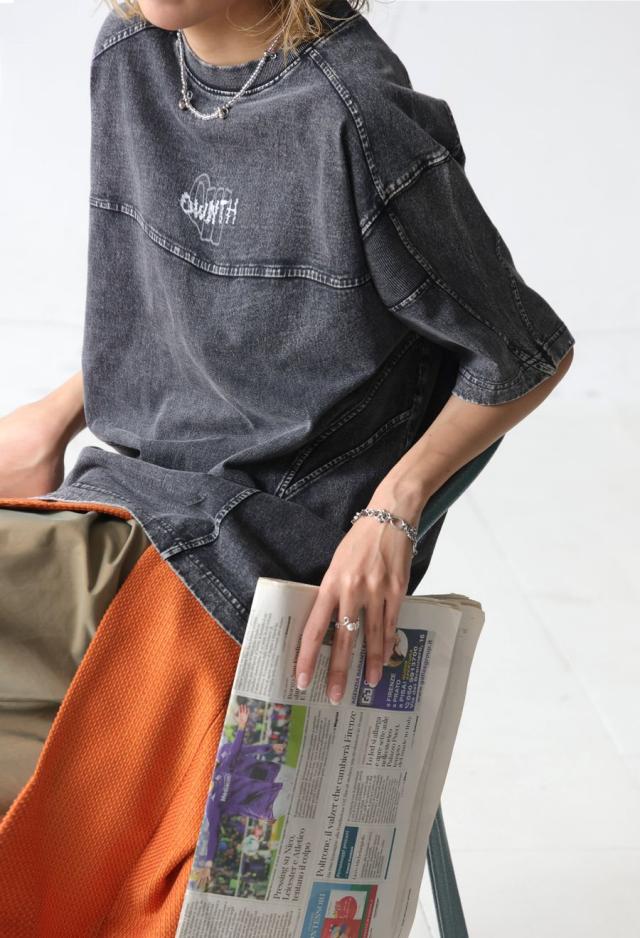 袖丈は肘にかかる五分袖(半袖)で、リラックス感のあるビッグシルエット。