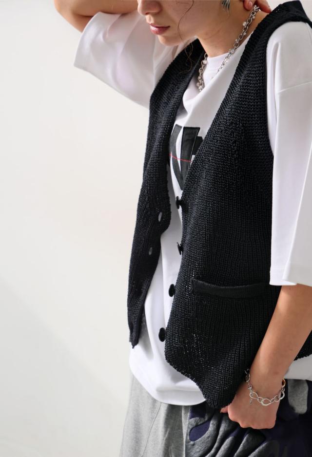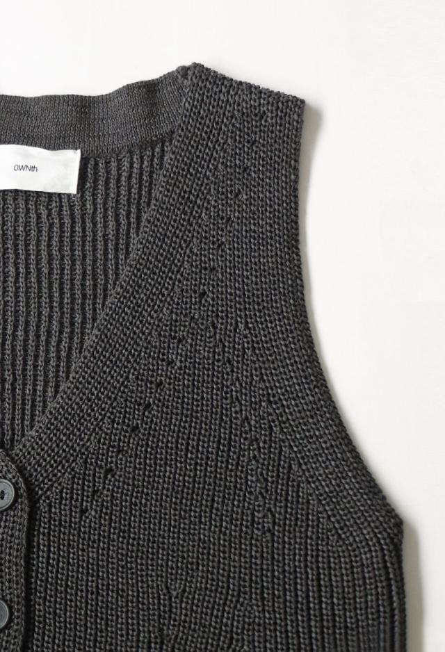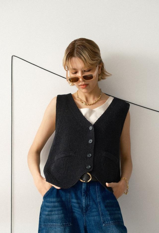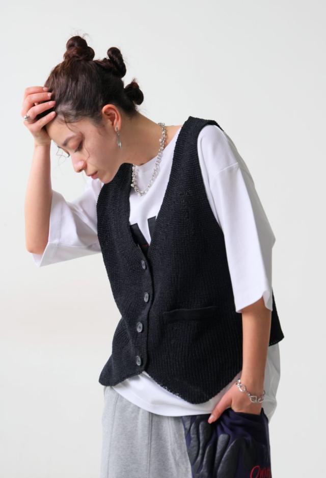 owt-0062 ニットベスト リネン風 フェイクポケット ボタンデザイン ノースリーブ レイヤード シンプル おしゃれ 上品 ゆったり 重ね着 カジュアル モード 無地 チクチクしない