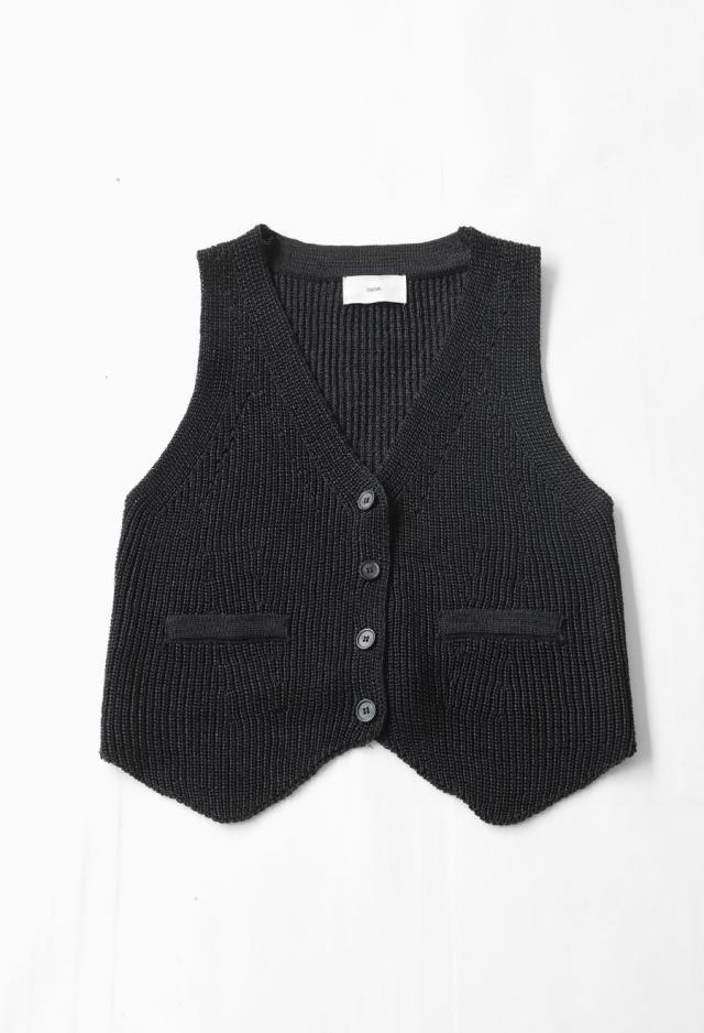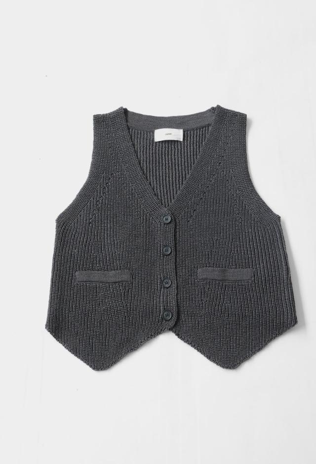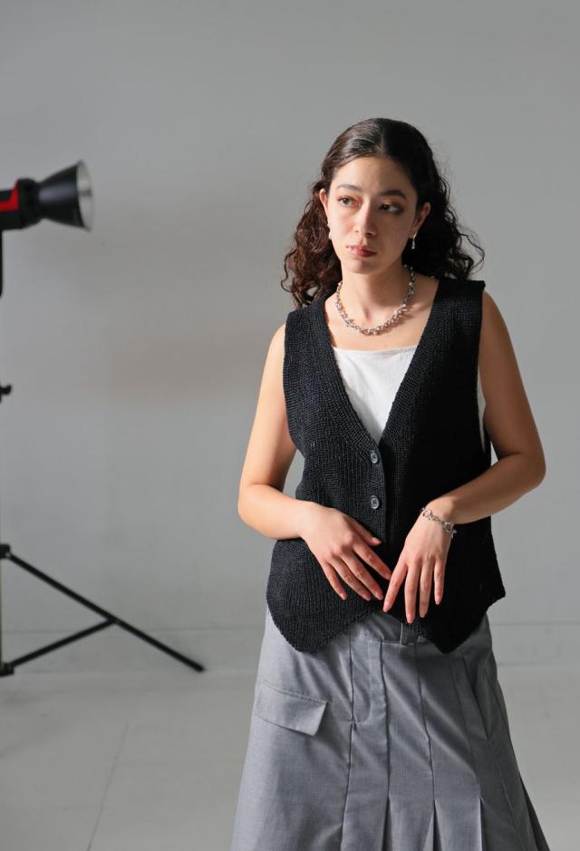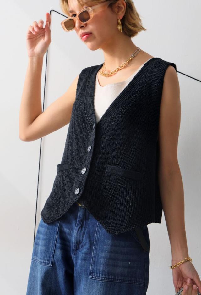 リネンタッチのソフトな風合いが魅力の、Vネックニットベストです。