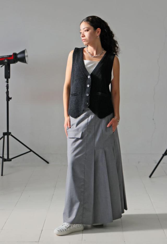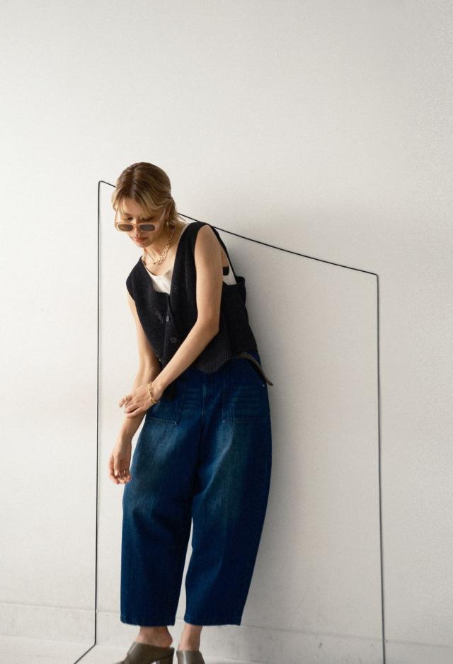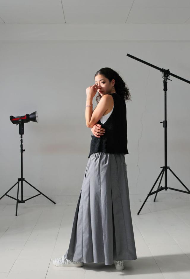 袖丈はノースリーブ仕様で、すっきりとした抜け感を演出。