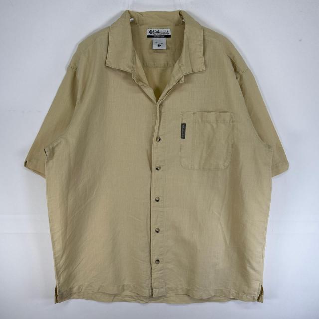 古着 コロンビア Columbia 半袖シャツ ラミー 麻 ワンポイント ロゴ 胸ポケ M ベージュ 無地 メンズ