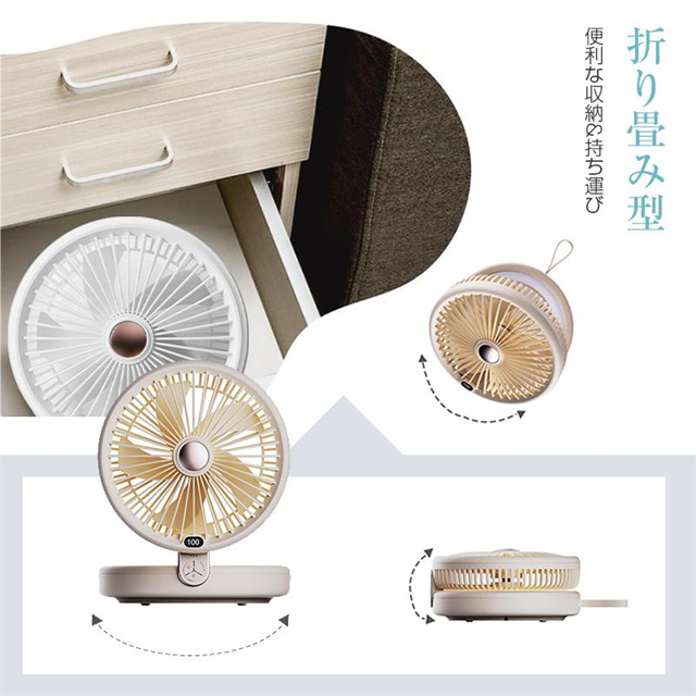 扇風機 多機能 デスクランプ ファン 卓上 壁掛け 2WAY仕様 5枚羽根 6段階風量調節 小型 シールフック付き 折りたたみ式 LEDライト 3段階明るさ調節 残電量表示