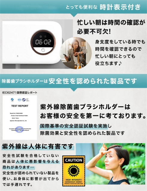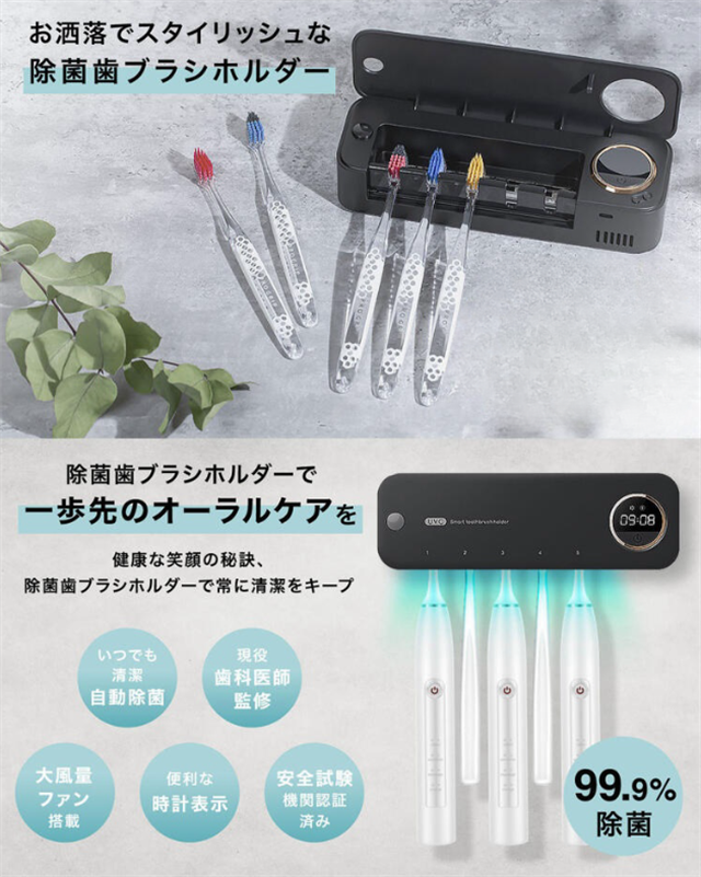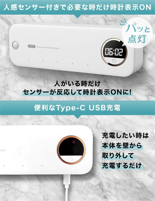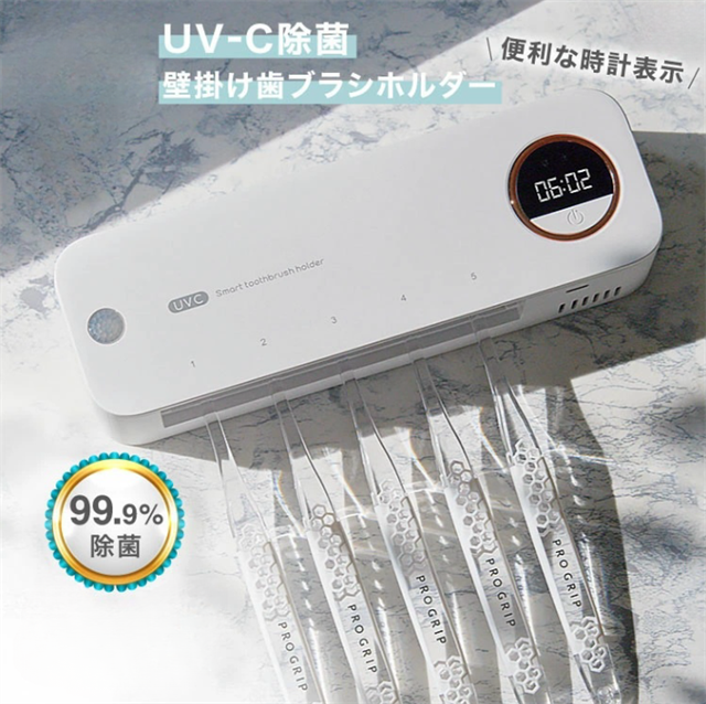 歯ブラシ 除菌器 除菌 歯ブラシホルダー 壁掛け UV除菌 おしゃれ 自動除菌 時計機能付き