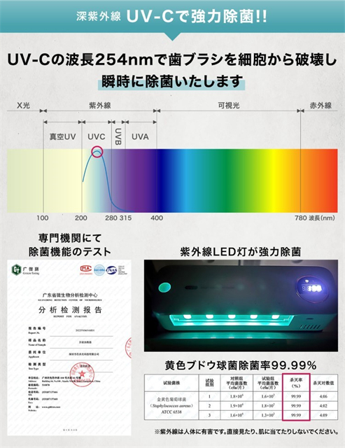 歯ブラシ後の雑菌に効果的な254nmの波長で菌を細胞から破壊!いつでも清潔な歯ブラシでブラッシングをサポート。