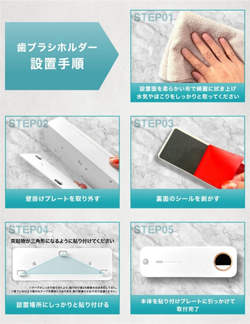壁に穴を空ける必要もなく、両面テープで設置が出来るので賃貸などでもご使用いただけます。歯ブラシをスタイリッシュに収納できる点も人気の秘密です。