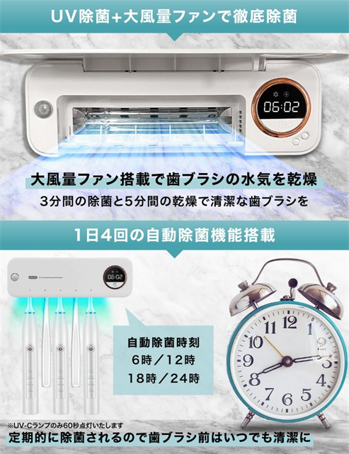 6時、12時、18時、24時の計4回自動で歯ブラシを除菌いたします。歯磨き前に定期的に自動で除菌されるのでいつでも清潔な歯ブラシをお使いいただけます。