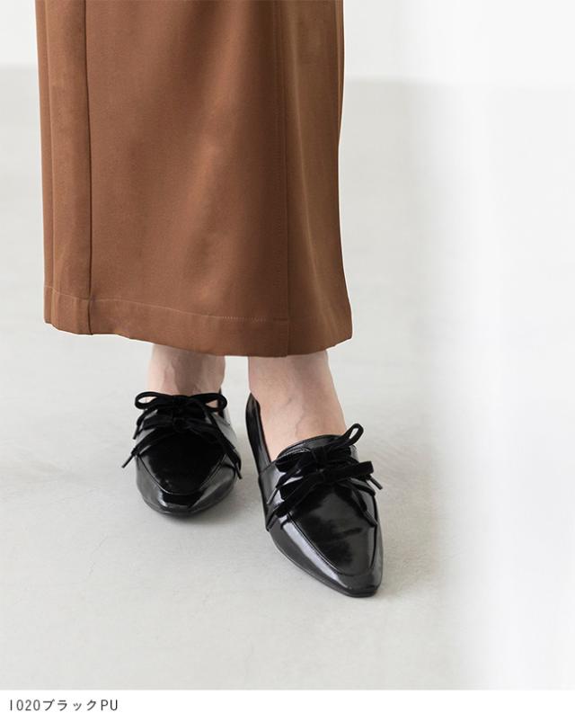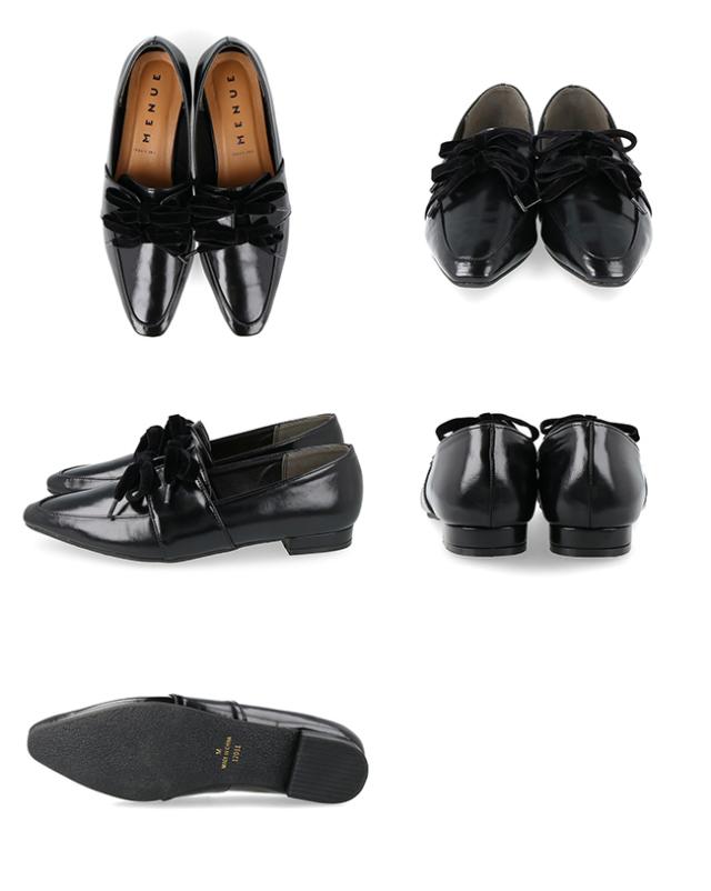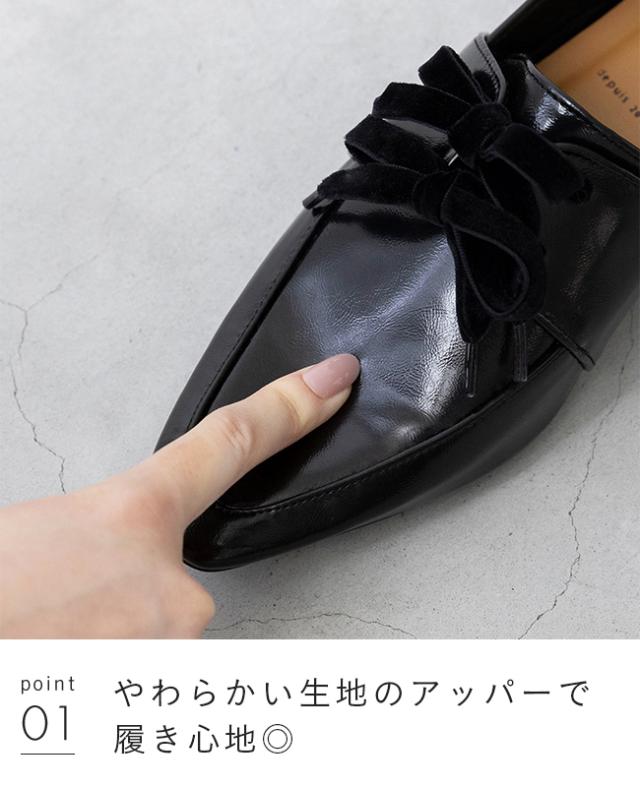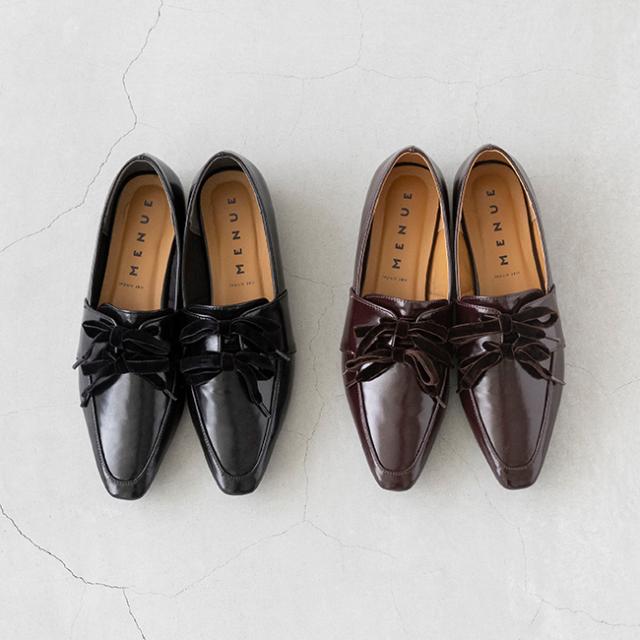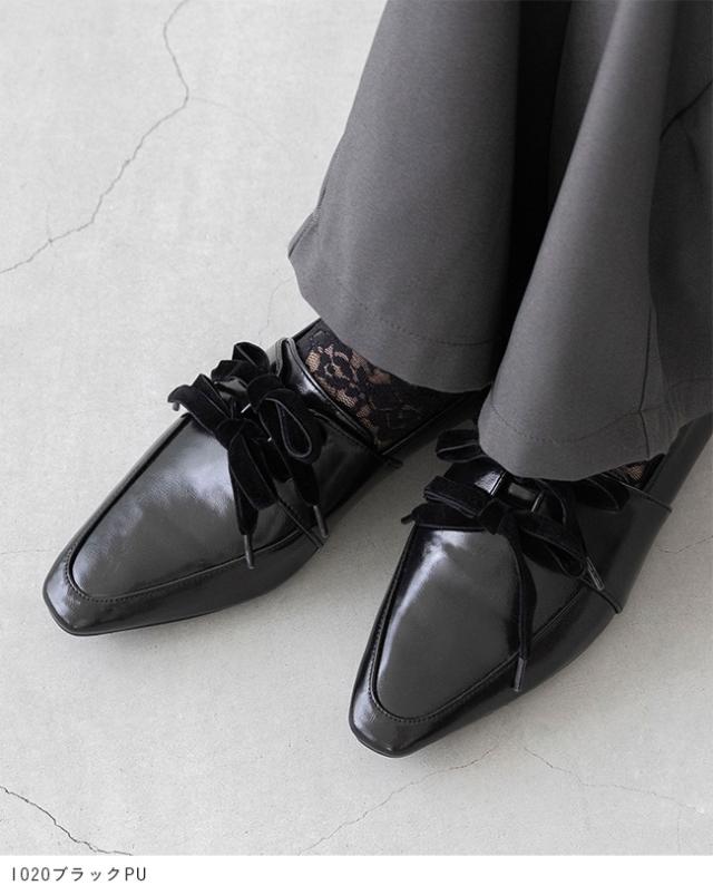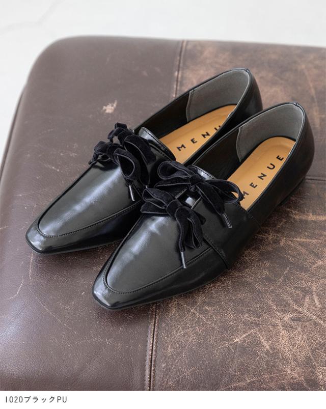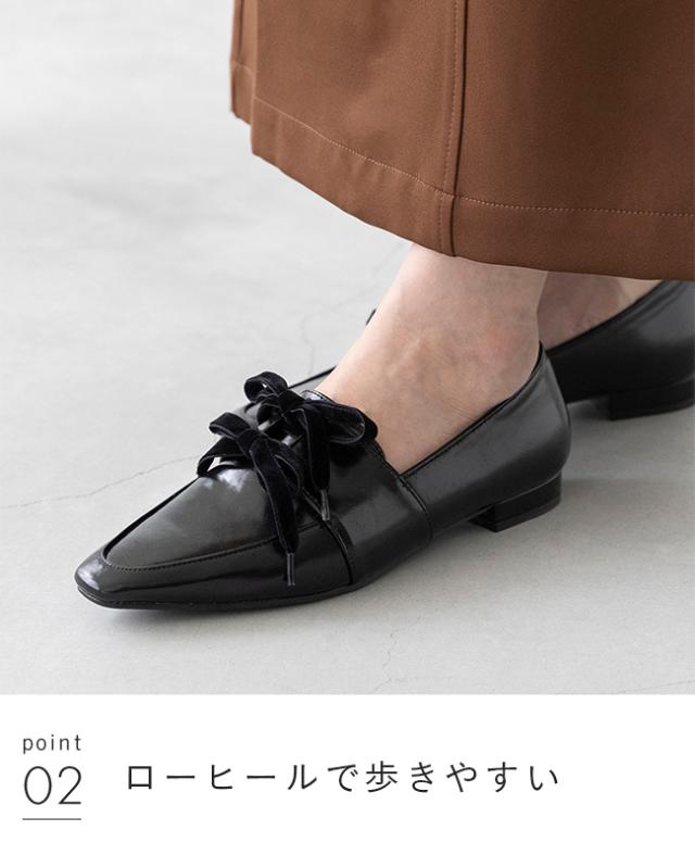 スッと伸びたトゥとベロアリボンが印象深い秋冬コーデにしてくれる、ベロアリボンスクエアトゥローファー