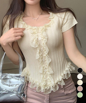 レースフリルニットトップスショート丈夏服 送料無料 即日発送