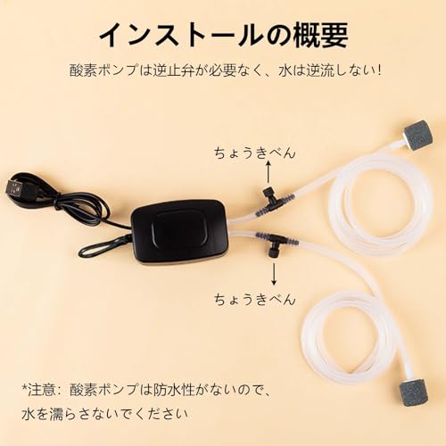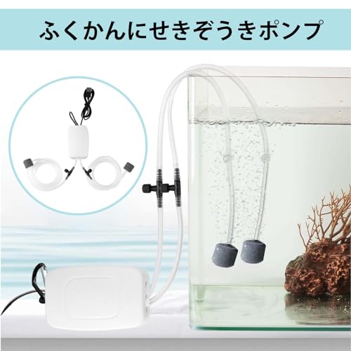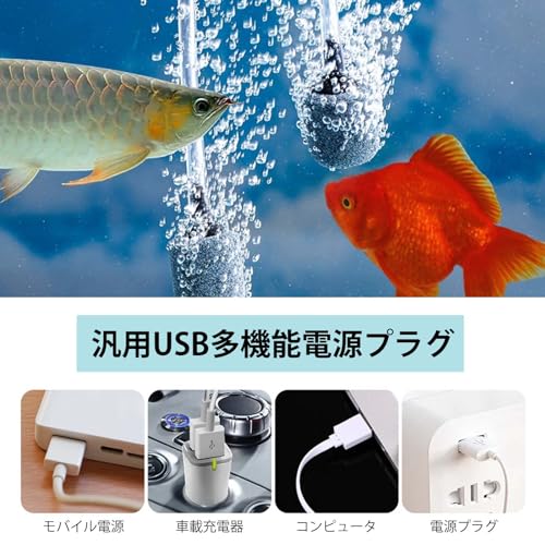 【商品仕様】セット内容:usb水槽用エアーポンプ×1、ソフトチューブ×2、エアストーン×2、USBケーブル×1、吊り下げ用バックル×1;電源線長さ:1m、エアチューブ長さ:1m、ポンプサイズ:5*8cm。