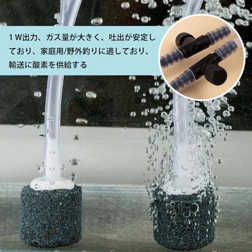 【実用的で使いやすく】この水槽エアーポンプは軽量で、持ち運びが簡単でスペースを節約できます。設置が簡単で、エアストーンとエアチューブを出力口に接続し、エアストーンを水槽に浸します。