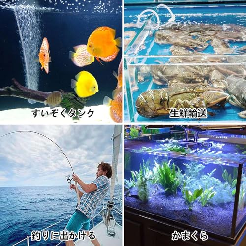 【適用範囲】この水槽エアーポンプは淡水魚から海水魚、食用魚にいたるまで幅広い分野の魚類に酸素を提供できます。このエアーポンプは軽くて持ち運びに便利で、様々な場合に適用です。例えば、水槽・魚の売り場・釣り時(給電でき場合)。