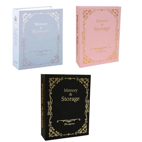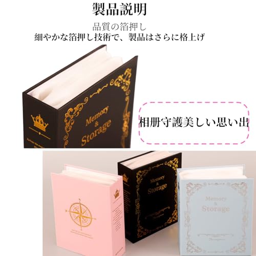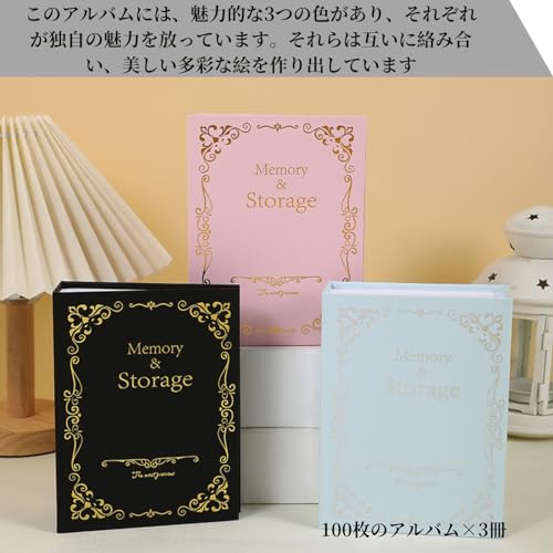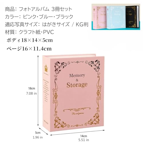 アンティーク調で可愛らしいフォトアルバム3カラーセットです。カラーはピンク、ブルー、ブラックの3冊となります。はがきサイズ、KG判の写真を1冊あたり100枚、3冊で300枚収納可能です。はがきホルダーとしてもご活用いただけるフォトアルバムです。