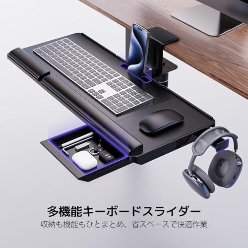 キーボードトレイ 机の上 机の下 両用 360度回転 クランプ式 後付け 引き出し付き 角度調節可能 テーブル拡張 収納性抜群 取付簡単フルーキーボード対応 ヘッドホンフック キーボードスライダー マウスパッド 幅62*25.4cm ブラック
