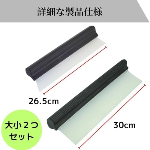 拭き取りの際、表面を傷つけないようコシは有るが、柔らかいシリコン素材を採用してます、水垢も残りませんし、幅30cmと26.5cmの大小2本セットですので、場所と用途により効果的に使い分けが可能です