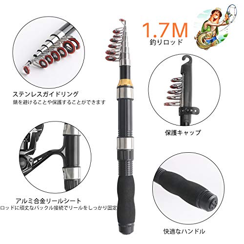 【1.7M釣り竿】:釣り竿はアルミニウム合金とグラス繊維混合構造を採用し、弾性に優れている同時に強度が高い。軽量で使いやすい伸縮式ロッドです。