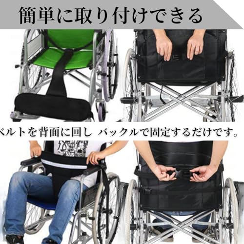 【簡単に取り付けできる】ベルトを背面に回し、2箇所バックルで固定するだけです。すぐに装着することができ、汎用モデルのため様々な車椅子に取り付けが可能です。