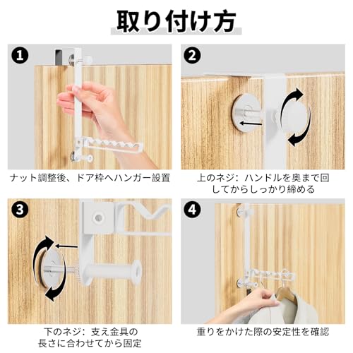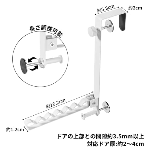 【製品規格と特徴】サイズ(展開時):高さ23cm × 幅21.8cm× 奥行2cm(対応ドア厚:2〜4cm)、重量0.3kg、耐荷重6kgを含み、高品質の金属材料、錆びに強い、折り畳み式設計で軽量で耐久性があり。折り畳み設計はスペースを節約し、収納しやすく、滑り止めマットが付属し、衣類やバッグの滑りを効果的に防ぎ、外観を清潔に保ちます。