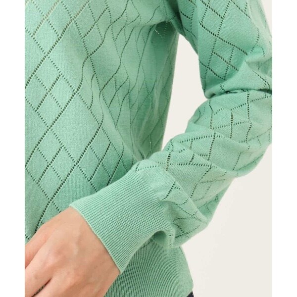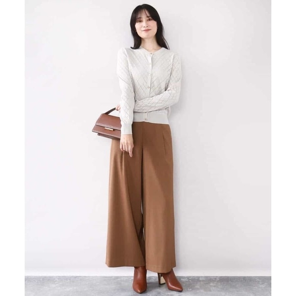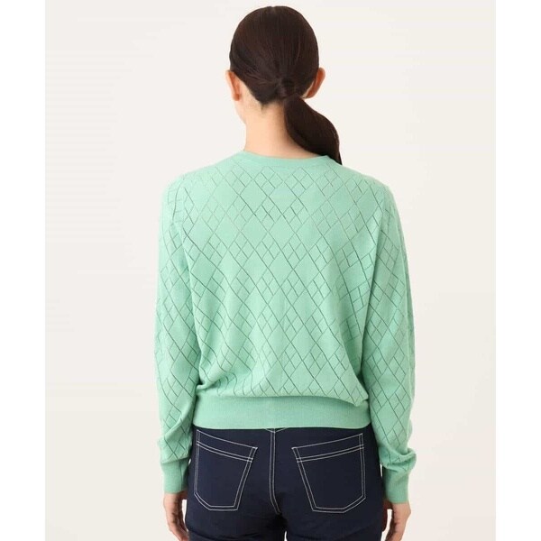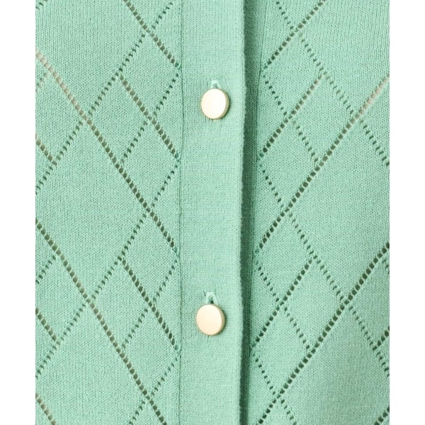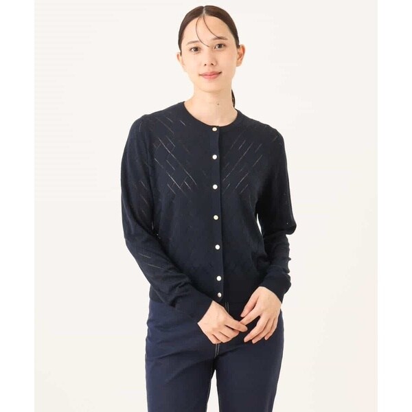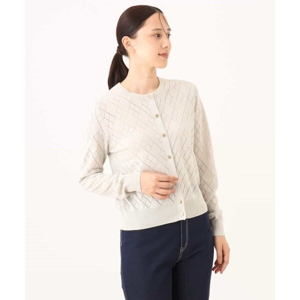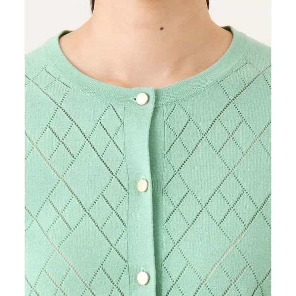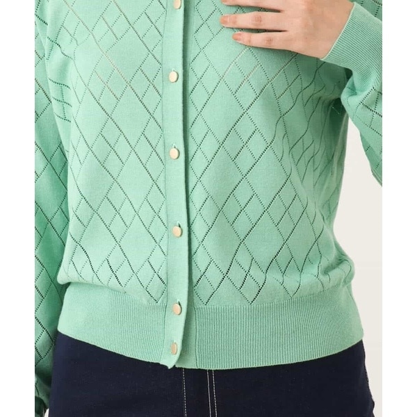 細かいアイレットでダイヤ柄を表現したニットカーディガン。柄部分は程よい透け感のある編地でポイントに。ベーシックでコンパクトなサイジングの長袖カーディガンは、艶消しのゴールド釦が大人の雰囲気に。