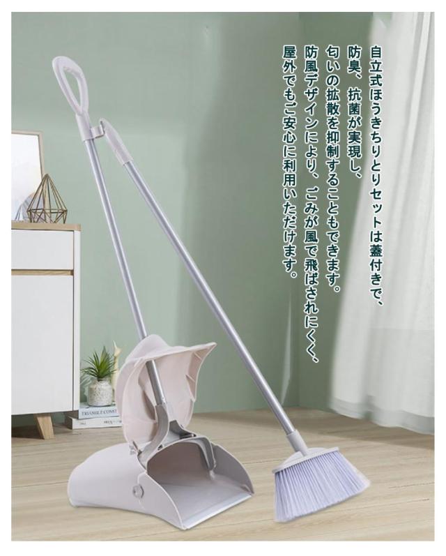 | ホウキとちりとりのセットです。 自立式ほうきちりとりセットは蓋付きで、防臭、抗菌が実現し、匂いの拡散を抑制することもできます。 防風デザインにより、ごみが風で飛ばされにくく、屋外でもご安心に利用いただけます。 平置きにするとちりとりが自動的に開いてゴミを掃除してくれます。掃除後にちりとりを持ち上げると自動的に立てられてゴミがこぼれないようになっています。 ちりとりには収納ホルダが付いて、ほうきが立て式になってコーナーに収納でき、ゴミも落なくなります。 持ち手部分にはフックを通せる穴が開いていますので、使わない時は壁に掛けて収納もできます。 お庭の樹木やカーポート、落ち葉、除雪作業や清掃に大変便利です。 ご家庭だけでなく、業務用としても幅広く愛されています。 廊下、ホテル、学校、体育館などの仕事場で掃除ができます。 | |
