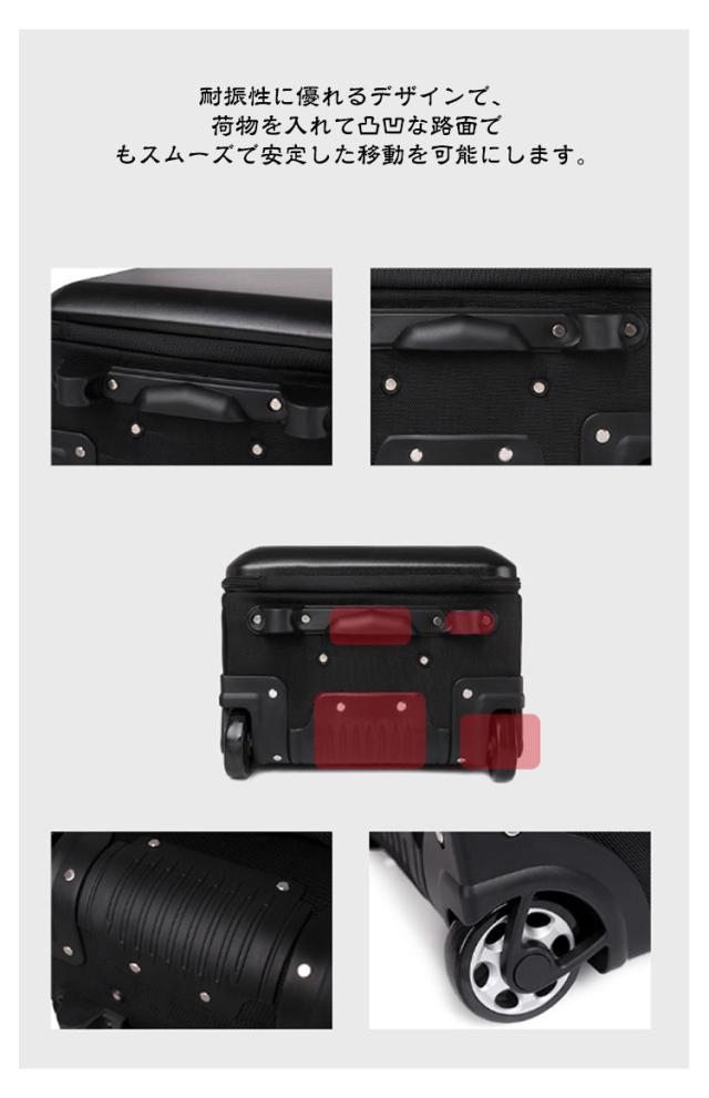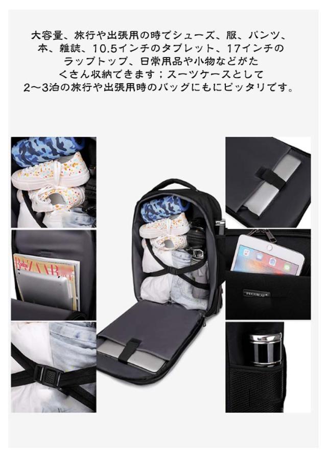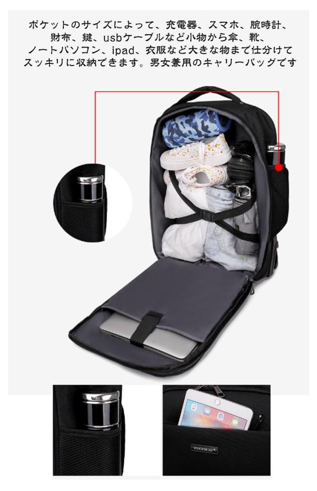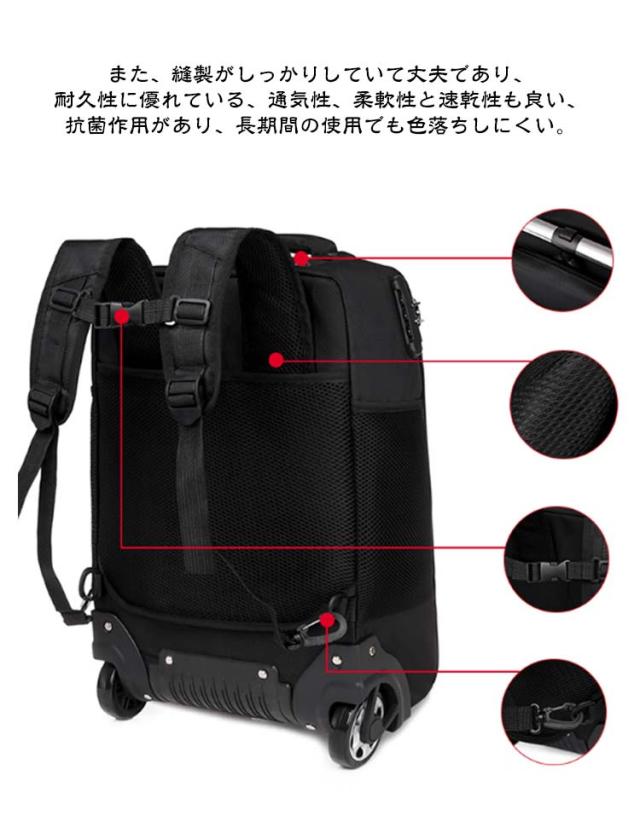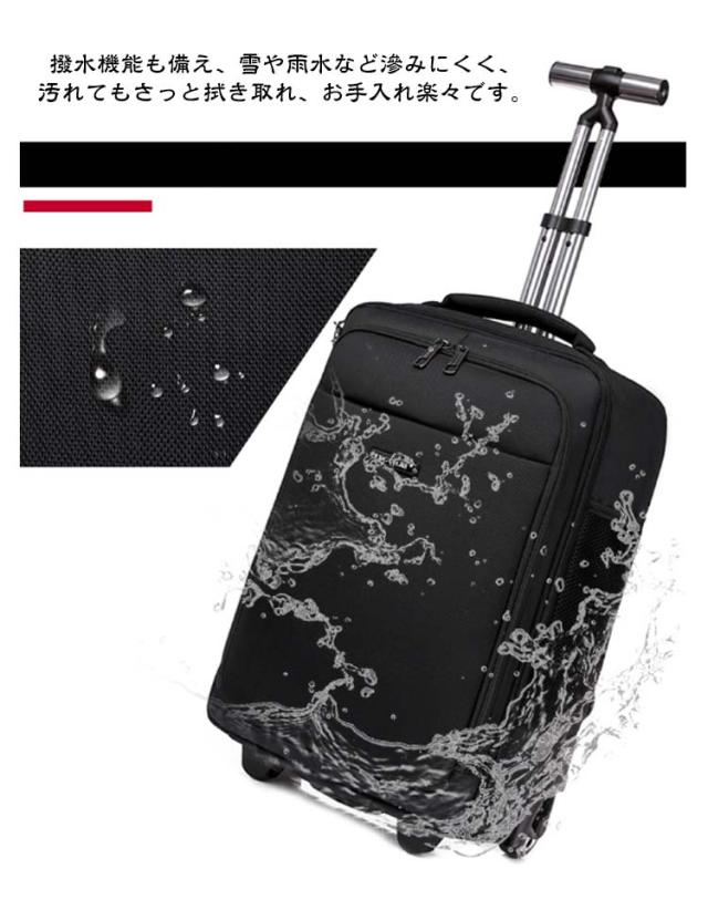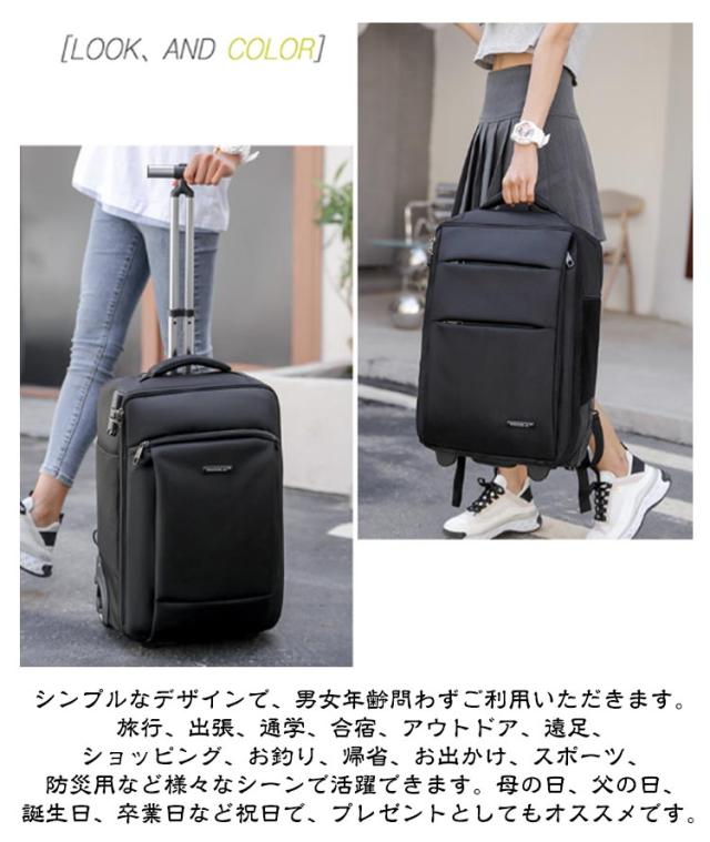 | 【高品質素材】:耐摩耗性に優れた丈夫なポリエステル素材と高品質の金属製ジッパーを取り入れ、上品な質感と耐久性を兼ね備え、長くご愛用いただけます。また、縫製がしっかりしていて丈夫であり、耐久性に優れている、通気性、柔軟性と速乾性も良い、抗菌作用があり、長期間の使用でも色落ちしにくい。撥水機能も備え、雪や雨水など滲みにくく、汚れてもさっと拭き取れ、お手入れ楽々です。 【バッグ仕様】:ポケットのサイズによって、充電器、スマホ、腕時計、財布、鍵、usbケーブルなど小物から傘、靴、ノートパソコン、ipad、衣服など大きな物まで仕分けてスッキリに収納できます。男女兼用のキャリーバッグです。 【3way・大容量キャリーバック】:普通のキャリーバッグと比べて、実用性に優れた3way多機能キャリーバッグリュックはキラキラ登場します。キャリー、リュックとしても、手提げとしても使用できます。自分のお好みによって、使用方式を自由的に調節できます。大容量、旅行や出張用の時でシューズ、服、パンツ、本、雑誌、10.5インチのタブレット、17インチのラップトップ、日常用品や小物などがたくさん収納できます;スーツケースとして2?3泊の旅行や出張用時のバッグにもにピッタリです。 【多段調節キャリバー&高品質キャスター】:アルミニウム製の超軽量のキャリバーは伸縮可能で、ご自分の身長に合わせて、スムーズな2段階調整が可能です。高弾性のゴムキャスターを採用し、より静かで耐摩耗性も向上しています。耐振性に優れるデザインで、荷物を入れて凸凹な路面でもスムーズで安定した移動を可能にします。 【様々なシーンで活躍】:シンプルなデザインで、男女年齢問わずご利用いただきます。旅行、出張、通学、合宿、アウトドア、遠足、ショッピング、お釣り、帰省、お出かけ、スポーツ、防災用など様々なシーンで活躍できます。母の日、父の日、誕生日、卒業日など祝日で、プレゼントとしてもオススメです。 | |