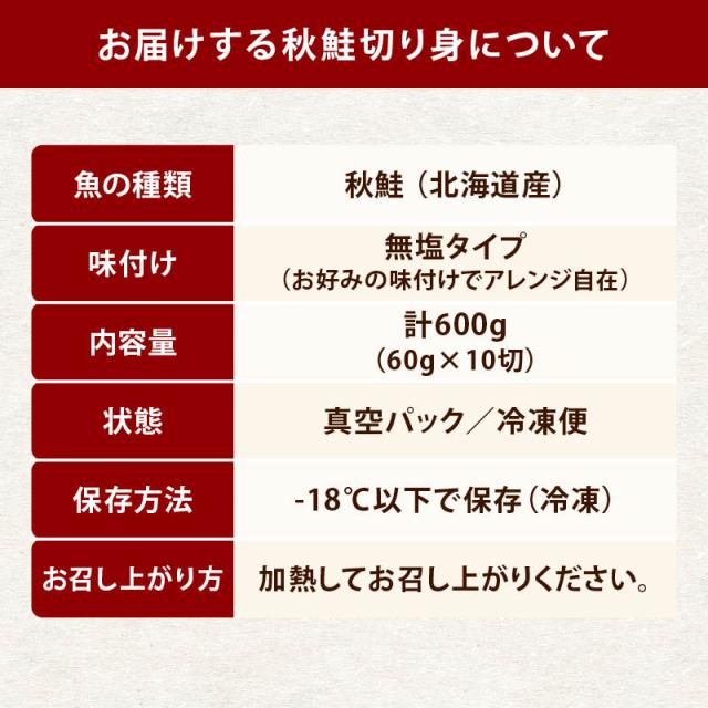 北海道産 秋鮭 無塩 骨なし 600g (60g x10切) 国産 鮭 さけ サケ お得用 ストック 簡単調理 お弁当 ホイル焼き フライ ムニエル 冷凍 骨取り 骨抜き 切り身 シーパラダイス 交洋 送料無料 前田家 MAEDAYA