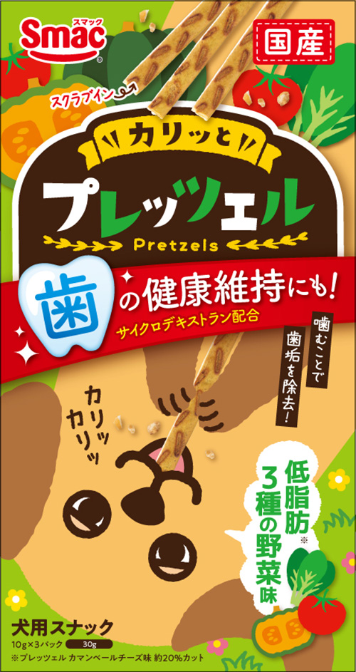 大切な愛犬のために全て食品用(ヒューマングレード)の原材料を使用した低脂肪タイプ(「プレッツェルカマンベールチーズ味」比約20%カット)3種の野菜味の犬用スナック「プレッツェル」です。愛犬の栄養バランスを考慮し、カロリー、脂質、塩分、糖分等を調整しました。 4970022014360