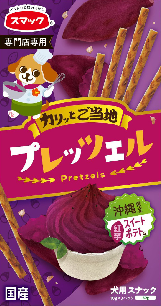 大切な愛犬のために全て食品用(ヒューマングレード)の原材料を使用した沖縄県産紅芋スイートポテト味の犬用スナック「プレッツェル」です。 愛犬の栄養バランスを考慮し、カロリー、脂質、塩分、糖分等を調整しました。 4970022013691