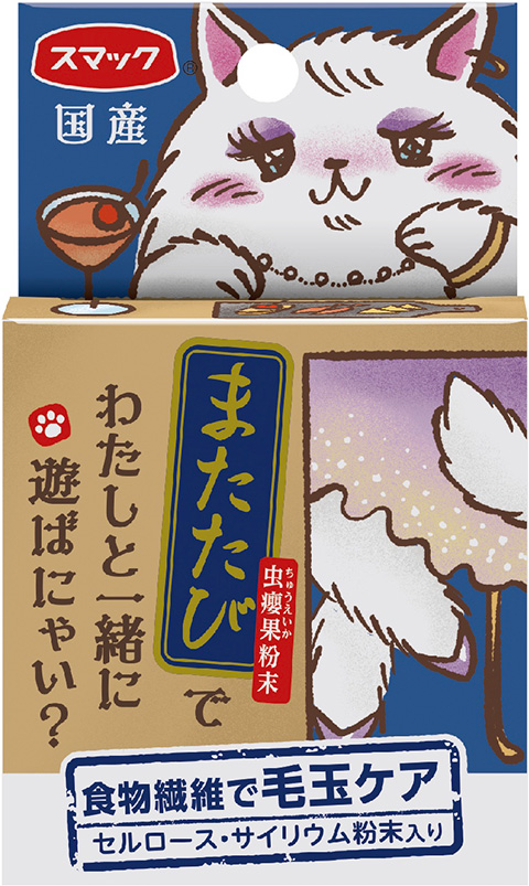 「猫にまたたび」と言うように、昔から愛猫家に重宝がられているまたたびの粉末。スマックではまたたびの実の中でも、猫が喜ぶ有効成分が通常の実よりも多く含まれている厳選した実『虫果(ちゅうえいか)』の純末を使用しています。 毛玉ケアのために、セルロース・サイリウム粉末を配合しました。 4970022022570