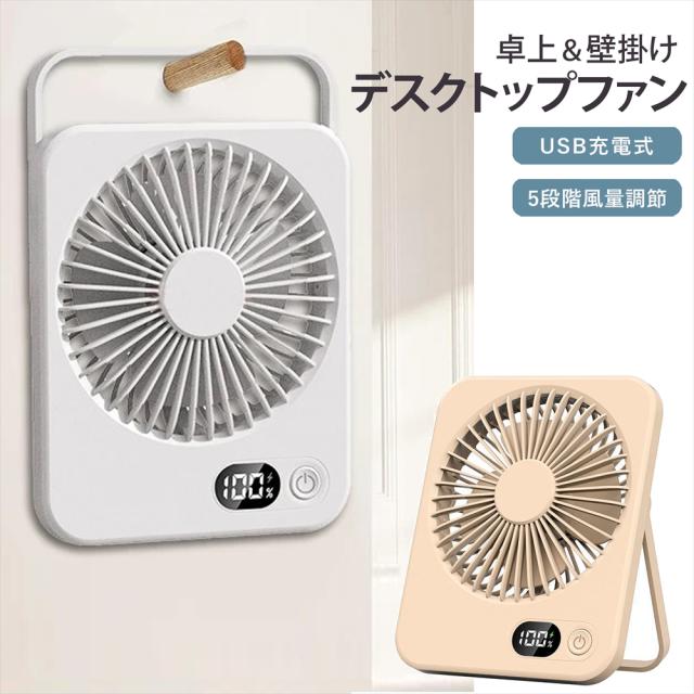 多機能 デスクトップファン USB充電式 5段階風量調節 卓上 壁掛け 吊り下げ ミニ扇風機 2025 Type-C 充電式 急速充電 充電残量表示 デジタルLED表示 180°角度調整 小型 軽量 薄型 静音設計 コードレス ポータブルファン ポータブル扇風機 コンパクト ベージュ ホワイト