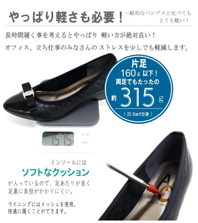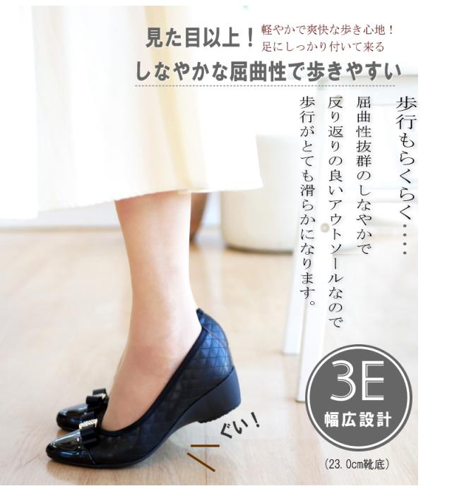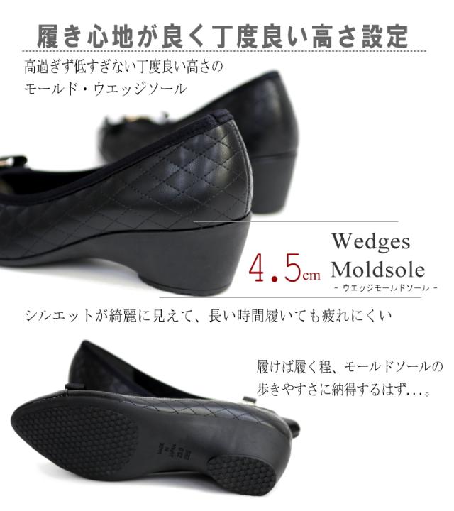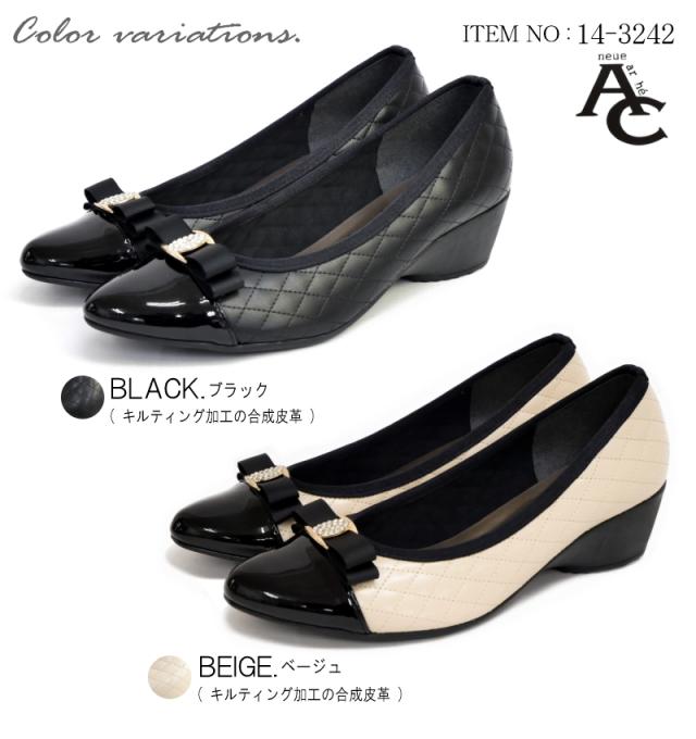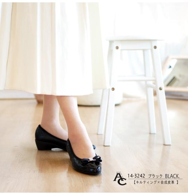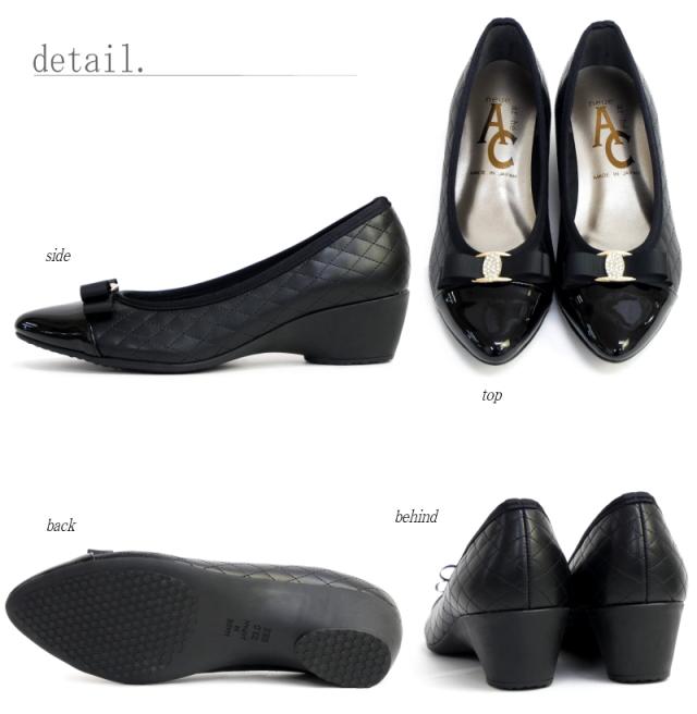AC アミュエルコンセプト パンプス 靴 レディース 日本製 リボン ラインストーン キルティング バイカラー アーモンドトゥ ウエッジ 黒 ベージュ 屈曲 軽い 結婚式 卒入学 仕事 通年 3e