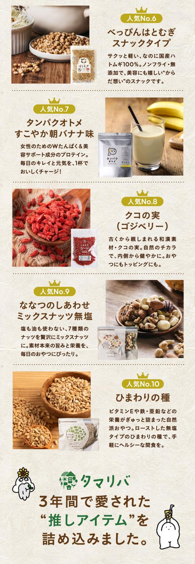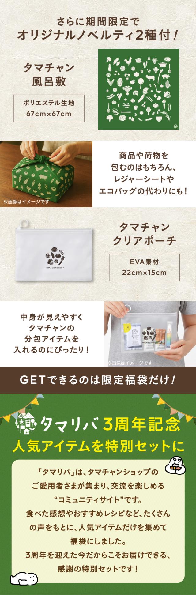 「タマリバ」はタマチャンショップのご愛用者さまが集まり、交流を楽しめる”コミュニティサイト”です。そこでのご感想やアレンジレシピなどのお声をもとに、人気アイテムだけを集めて福袋にしました。