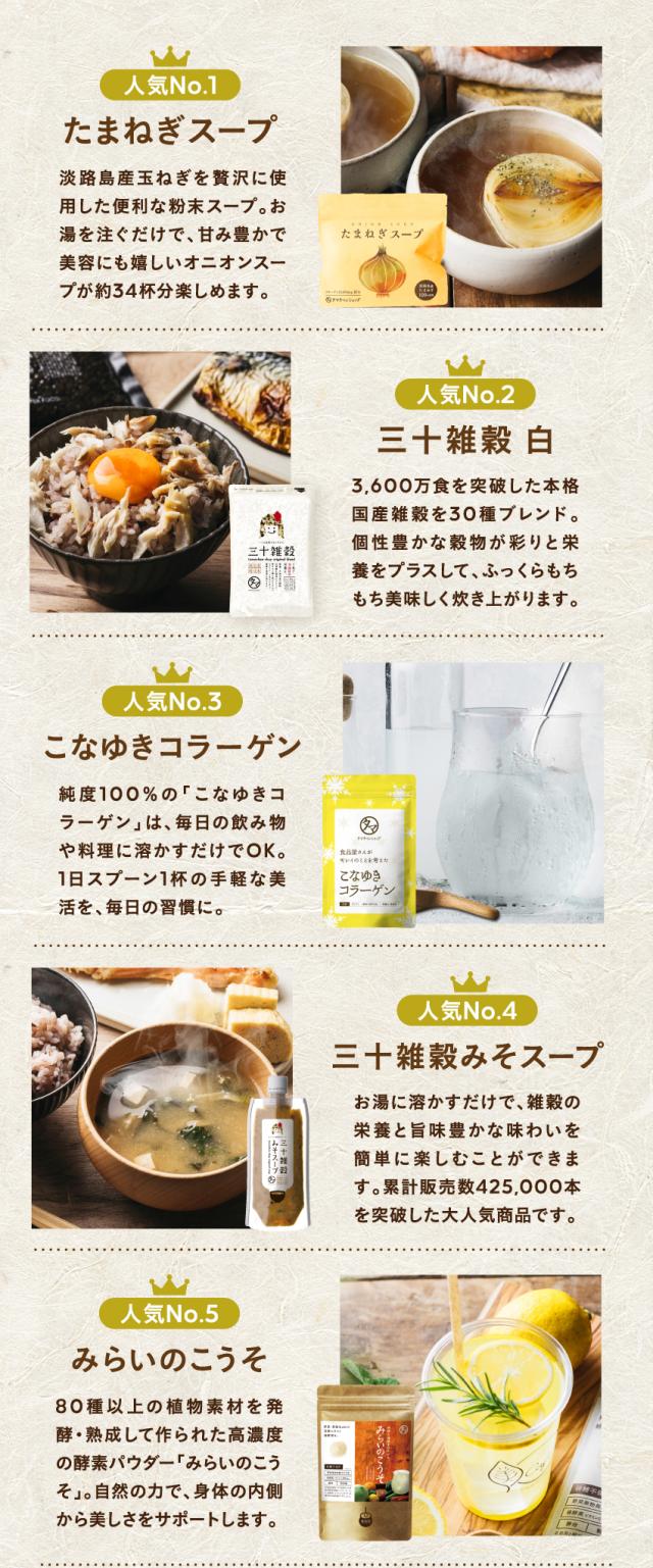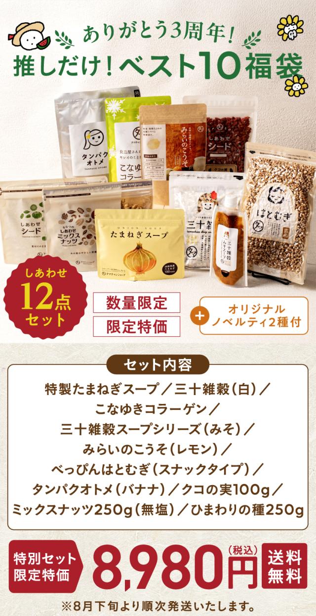 【セット内容】特性たまねぎスープ(コラーゲン入り)/三十雑穀(白)/こなゆきコラーゲン/三十雑穀スープシリーズ(みそ)/みらいのこうそ(レモン)/べっぴんはとむぎ(スナックタイプ)/タンパクオトメ(バナナ)/クコの実100g/ミックスナッツ250g(無塩)/ひまわりの種250g/ノベルティー2種