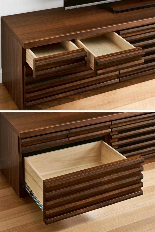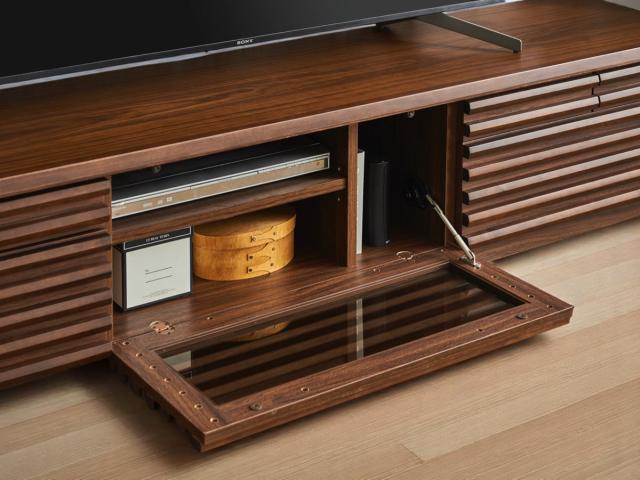 環境に配慮したFSC認証を取得した天然木工芸突板を使用したテレビボードです。前板のルーバー部分には無垢を贅沢に使い、置くだけで存在感のある佇まいです。背面は化粧仕上げが施され、細部まで手を抜かず、丹精込めて製造されています。