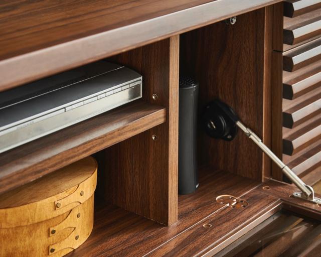 AV機器の設置におすすめの中央のフラップ扉。ゆっくり静かに扉が開くスローダウンステーを採用しているので安全です。中央の前板のみ、ルーバー部分の隙間が空いているので、扉を閉めたままでも、リモコンの操作が可能です。
