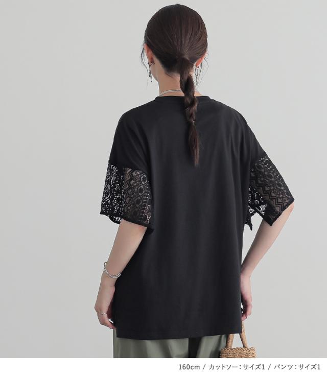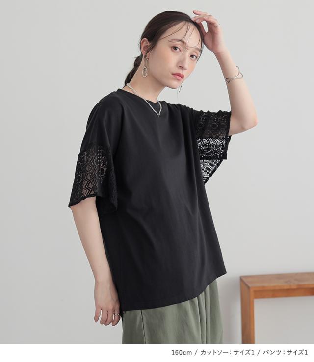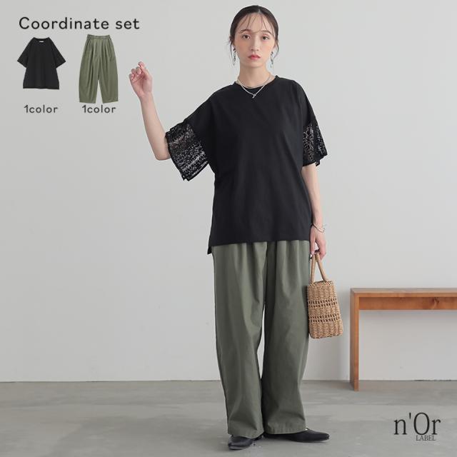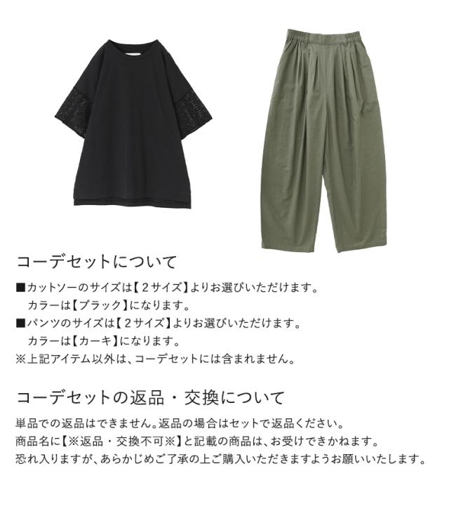 『レーススリーブカットソー×綿麻混冷感バレルレッグパンツコーデ2点SET』【メール便不可】【20】[2点コーデセット 2025 レディース カットソー トップス Tシャツ 半袖 パンツ ボトムス タック ロング 吸水速乾]