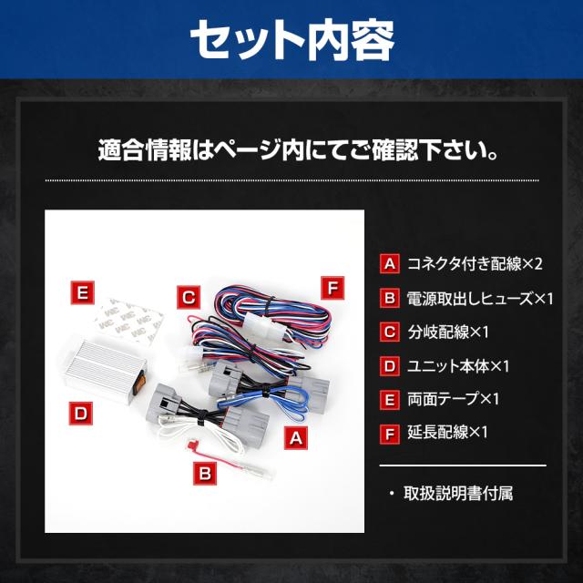 [A]専用コネクタ ×2 [B]電源取出しヒューズ ×1 [C]分岐配線 ×1 [D]ユニット本体 ×1 [E]両面テープ ×1 [F]延長配線 ×1 ・取扱説明書 |
