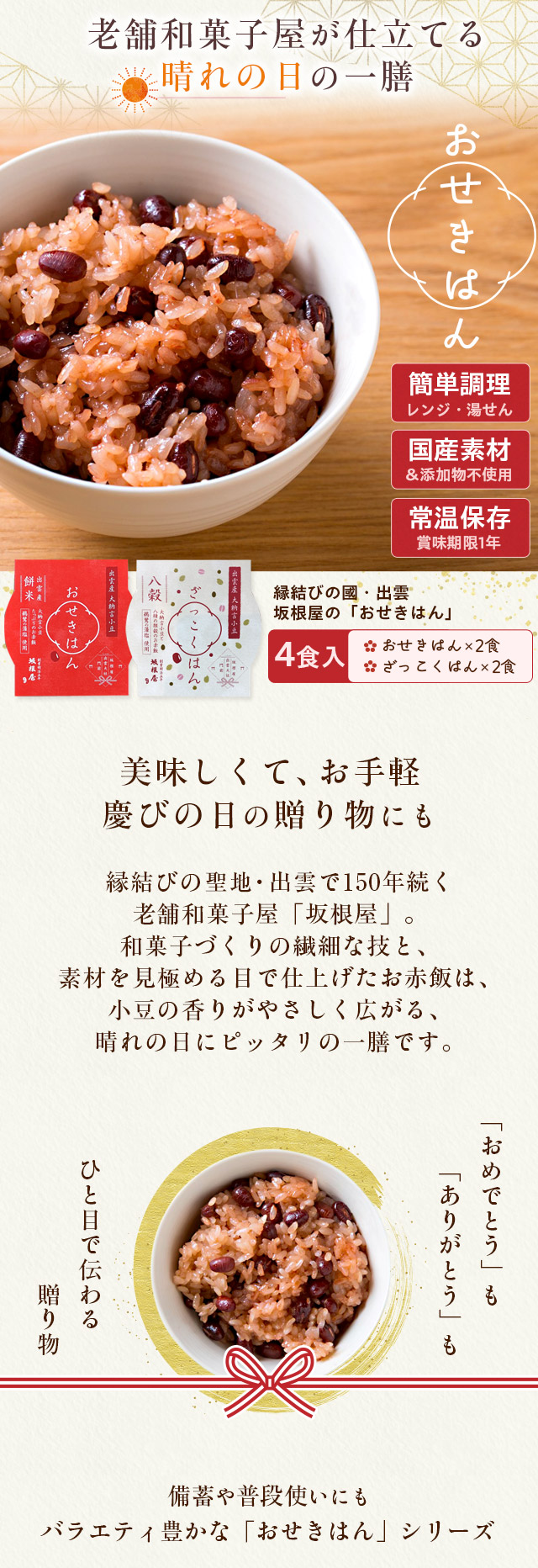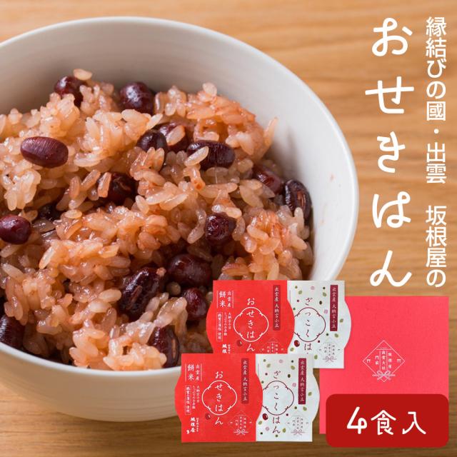 縁結びの國・出雲 坂根屋の「おせきはん」4個入 無添加 国産原料 赤飯 お赤飯 おこわ おふかし 雑穀ごはん レトルト レンジで温めるだけ お祝い 贈り物 ギフト プレゼント 送料無料(北海道・沖縄を除く)