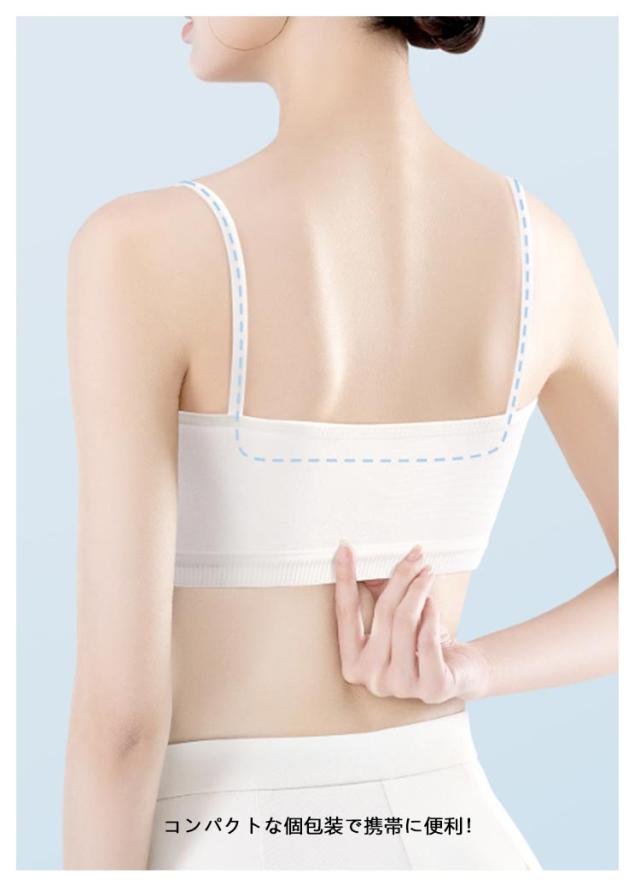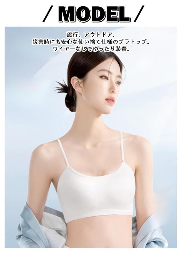 | 【使い捨てブラ】 【10枚セット】 【M〜3XL】 旅行、アウトドア、災害時にも安心な使い捨て仕様のブラトップ。ワイヤーなしでゆったり装着。 肌触りがよく、通気性も抜群。洗えない環境や数日間着用する場合にストレスになりにくい下着です。圧迫感がなく昼も夜も快適なつけ心地のブラジャーです。 胸を圧迫せず正しい位置に導くパッド付。ディスポーザブルでもしっかりとしたつくりで、1枚でも透けず複数回の使用が可能です。 コンパクトな個包装で携帯に便利! | |