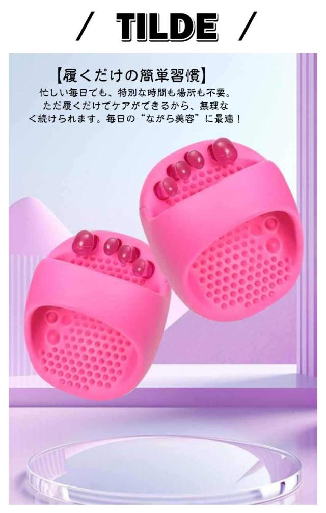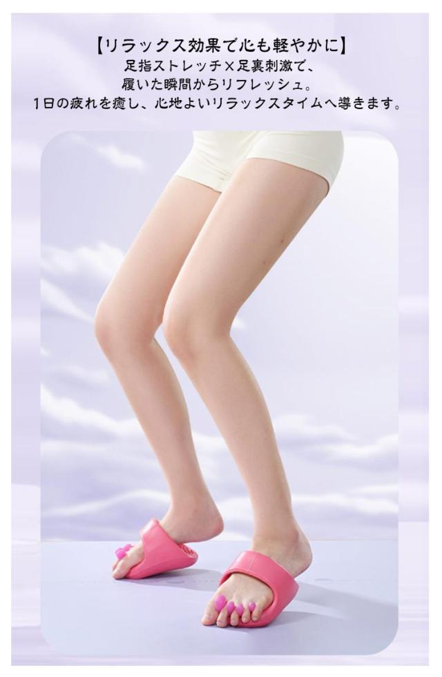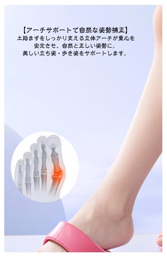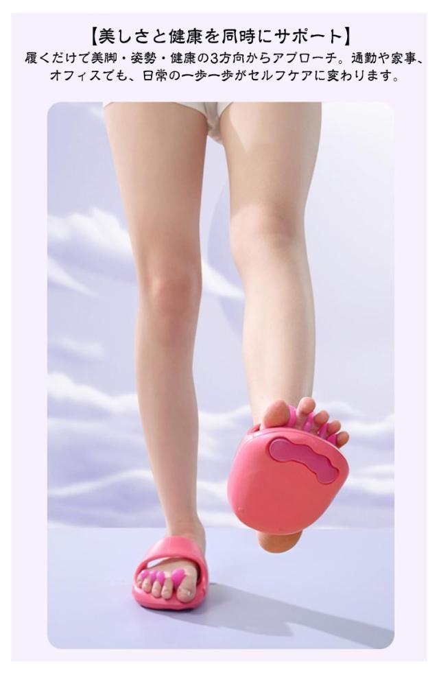 | 履くだけで美脚ケアダイエットスリッパ。 【履くだけで美脚ケア&巡りサポート】 特殊設計のインソールが足裏のツボを優しく刺激。歩くだけで巡りを整え、むくみを軽減。スッキリ引き締まった美脚ラインへ導きます。 【アーチサポートで自然な姿勢補正】 土踏まずをしっかり支える立体アーチが重心を安定させ、自然と正しい姿勢に。美しい立ち姿・歩き姿をサポートします。 【美しさと健康を同時にサポート】 履くだけで美脚・姿勢・健康の3方向からアプローチ。通勤や家事、オフィスでも、日常の一歩一歩がセルフケアに変わります。 【履くだけの簡単習慣】 忙しい毎日でも、特別な時間も場所も不要。ただ履くだけでケアができるから、無理なく続けられます。毎日の“ながら美容”に最適! 【リラックス効果で心も軽やかに】 足指ストレッチ×足裏刺激で、履いた瞬間からリフレッシュ。1日の疲れを癒し、心地よいリラックスタイムへ導きます。 | |