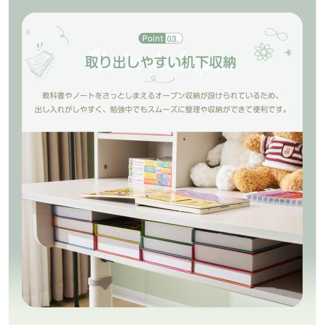 【取り出しやすい机下収納】教科書やノートをさっとしまえるオープン収納が設けられているため、出し入れがしやすく、勉強中でもスムーズに整理や収納ができて便利です。