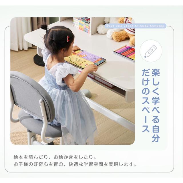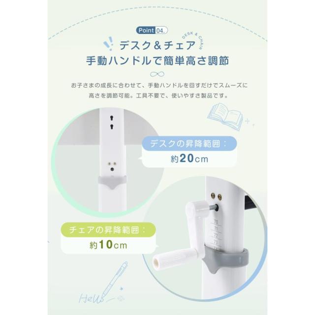 【デスク&チェア手動ハンドルで簡単高さ調節】お子さまの成長に合わせて、手動ハンドルを回すだけでスムーズに高さを調節可能。工具不要で、使いやすさ製品です。
