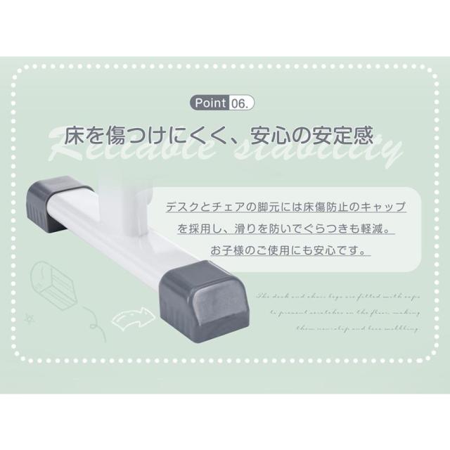 【床を傷つけにくく、安心の安定感】デスクとチェアの脚元には床傷防止のキャップを採用し、滑りを防いでぐらつきも軽減。お子様のご使用にも安心です。