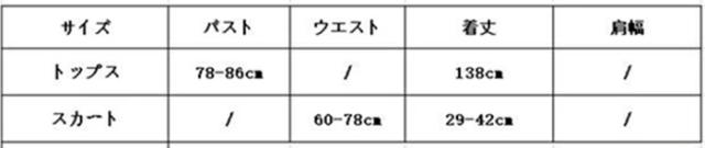 Fサイズ:バスト78-86cm スカートのウェスト60-78cm トップスの丈29/42cm スカートの丈35cm