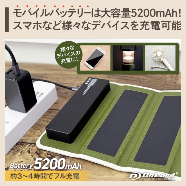 ★モバイルバッテリーは大容量5200mAh!スマートフォンなど様々なデバイスへ充電可能。USB Type-CとType-A端子を搭載しているので、2台同時充電も可能。ソーラー充電だけでなくコンセントからの充電も可能 ★折りたためるからコンパクトに持ち運び可能、ゴムバンド付 ★防塵防水IP55で屋外の使用に最適 ★付属のカラビナで吊るしても使える ★充電残量はランプでお知らせ